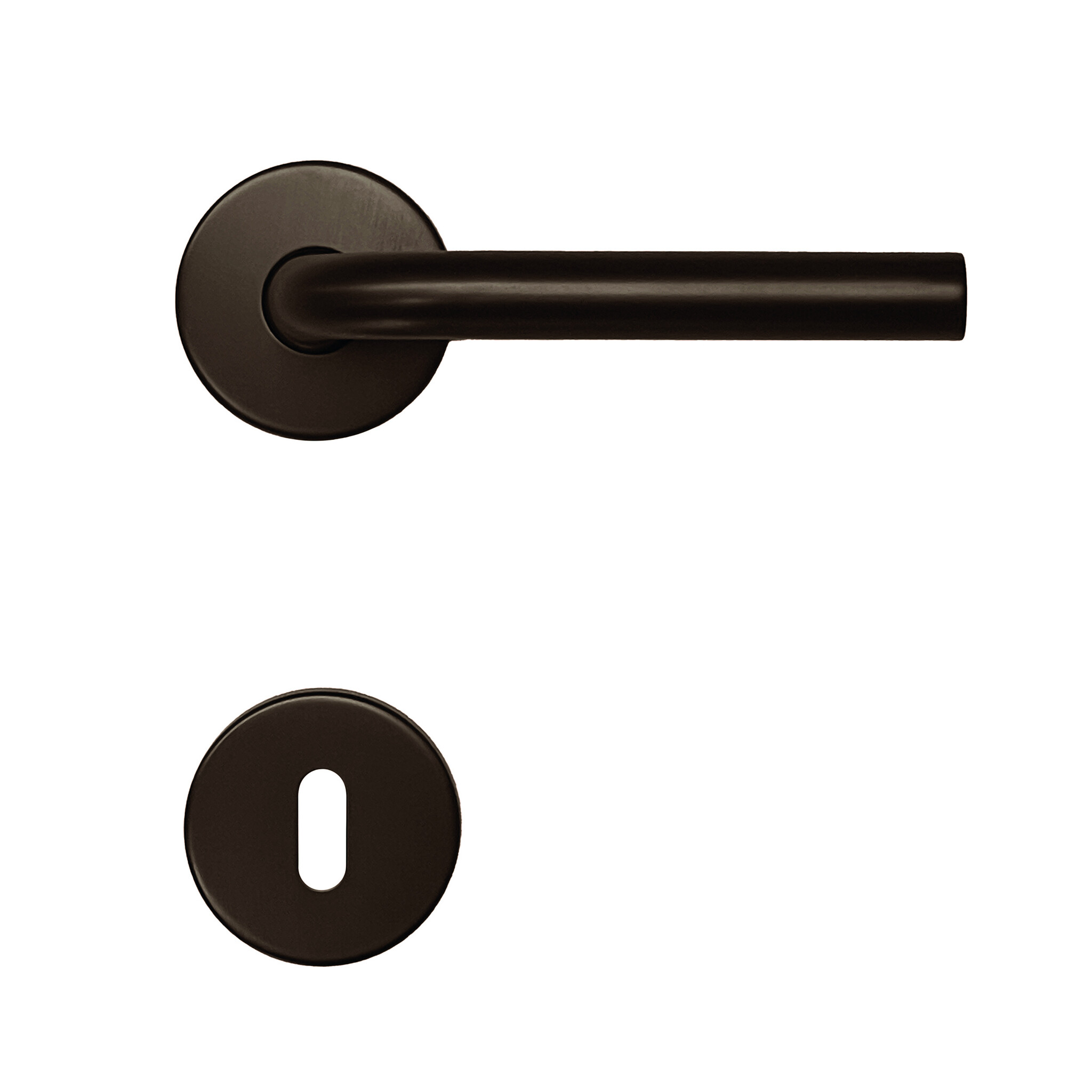 Paire de nouvelles poignées de porte en bronze FORME L 16 mm sur rosaces rondes en acier inoxydable avec une finition bronze mat disponible en 4 variantes