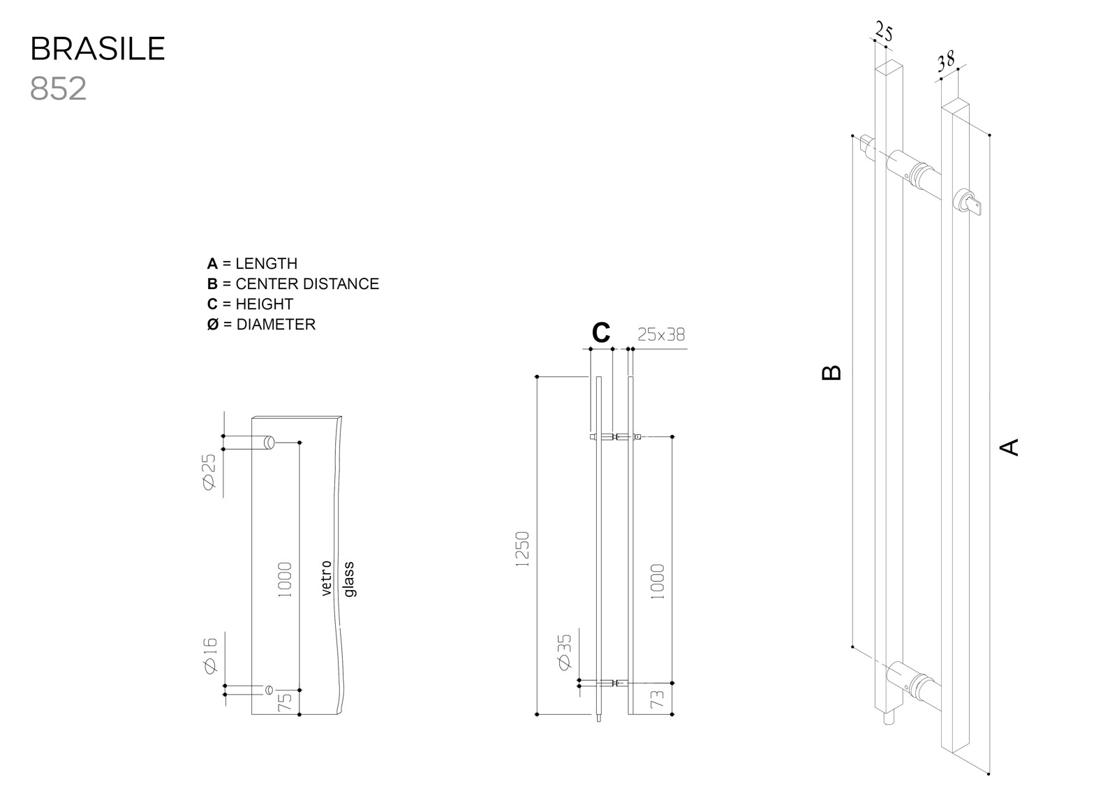 Ces poignées de porte verrouillables en acier inoxydable ont une forme rectangulaire de 38x25 mm, une profondeur de 125 mm (C), une taille d'axe de 1 000 mm (B) et une longueur totale de 1 250 mm (A).