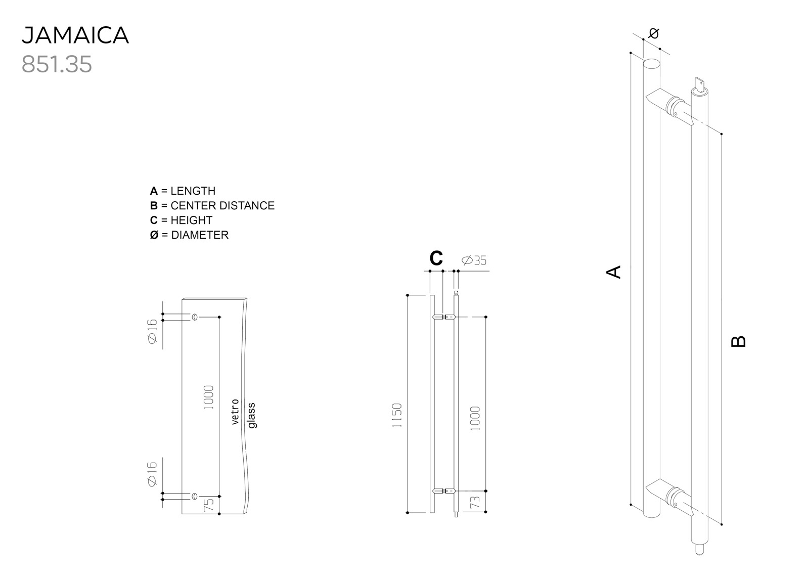 Ces poignées de porte verrouillables en acier inoxydable ont un Ø de 35 mm, une profondeur de 85 mm (C), une taille d'axe de 1000 mm (B) et une longueur totale de 1150 mm (A).