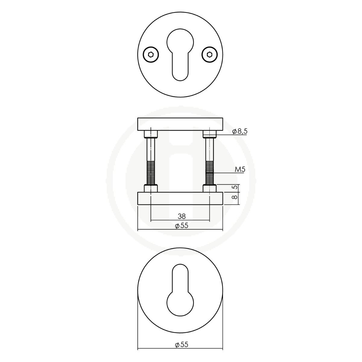 L'ensemble d'un Ø de 55 mm et d'une épaisseur de 8 mm est recouvert d'un côté, ce qui signifie qu'il n'y a que des trous de vis visibles sur un côté.