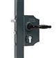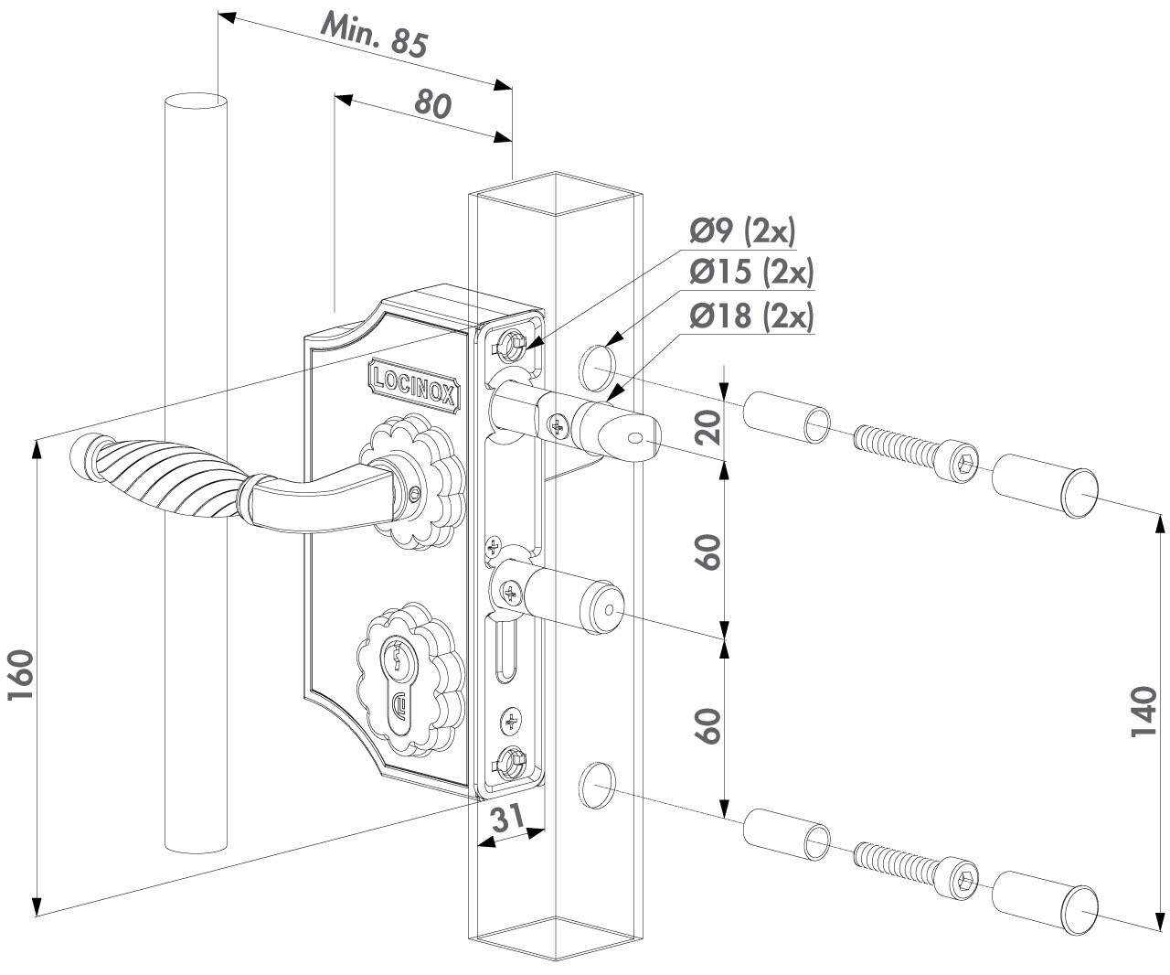 Pour une installation rapide et extrêmement précise, nous vous recommandons d'utiliser le gabarit de perçage Drill-Fix. Cette serrure de portail décorative en saillie convient aux profilés carrés de 40 à 50 mm et est fournie avec 3006FA - Jeu de poignées et cylindre en Zamac.