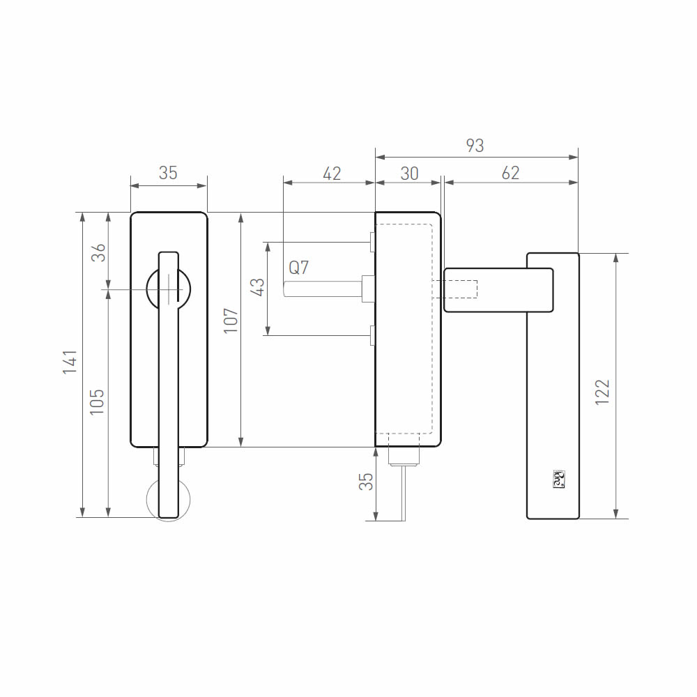 La rosace rectangulaire mesure 107x35mm et la goupille carrée (7x7mm) a une longueur de 30mm.
