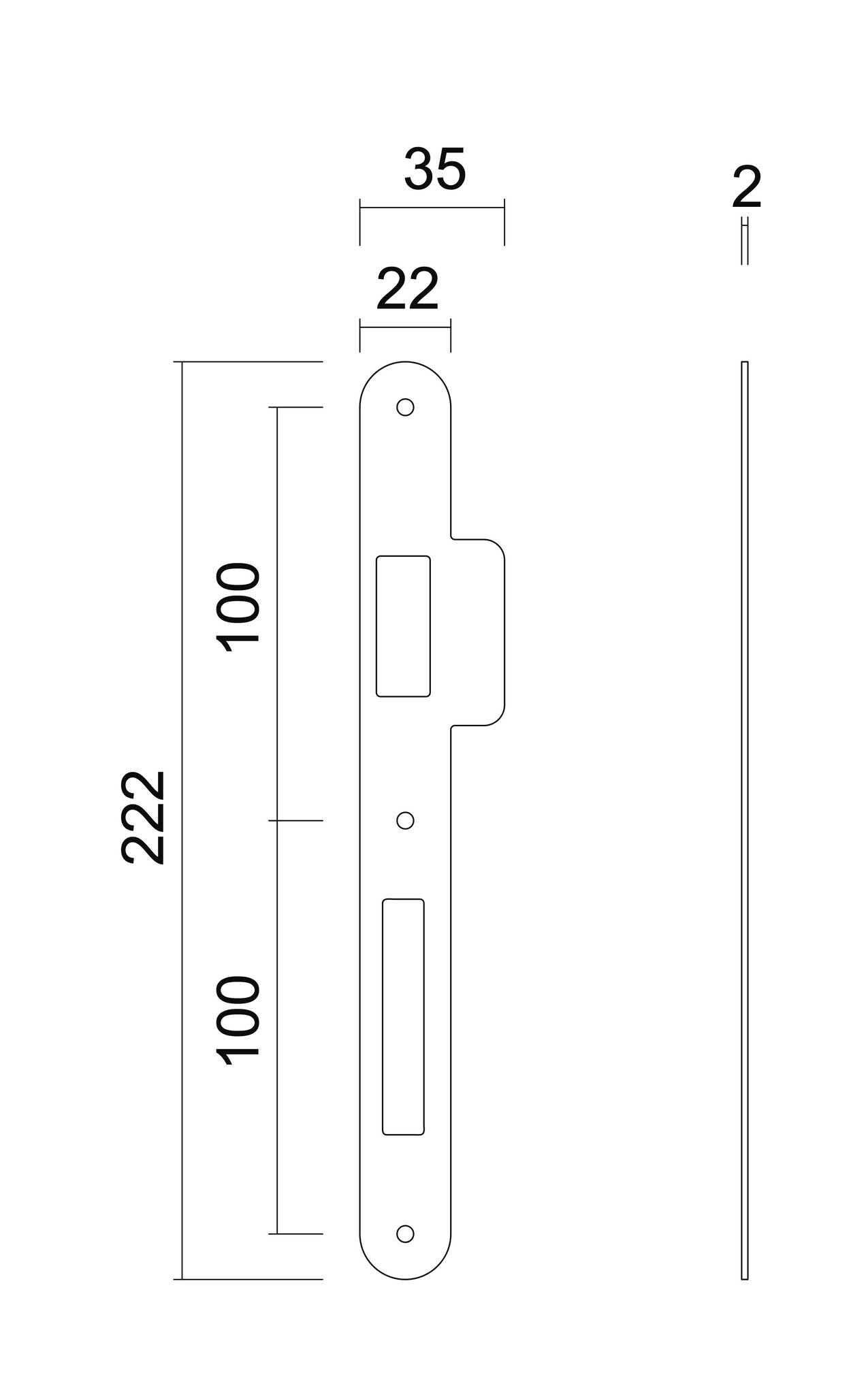 Cette contre-plaque étroite a une largeur totale de 35 mm et une hauteur totale de 222 mm. Le rebord arrondi mesure 12 x44 mm.