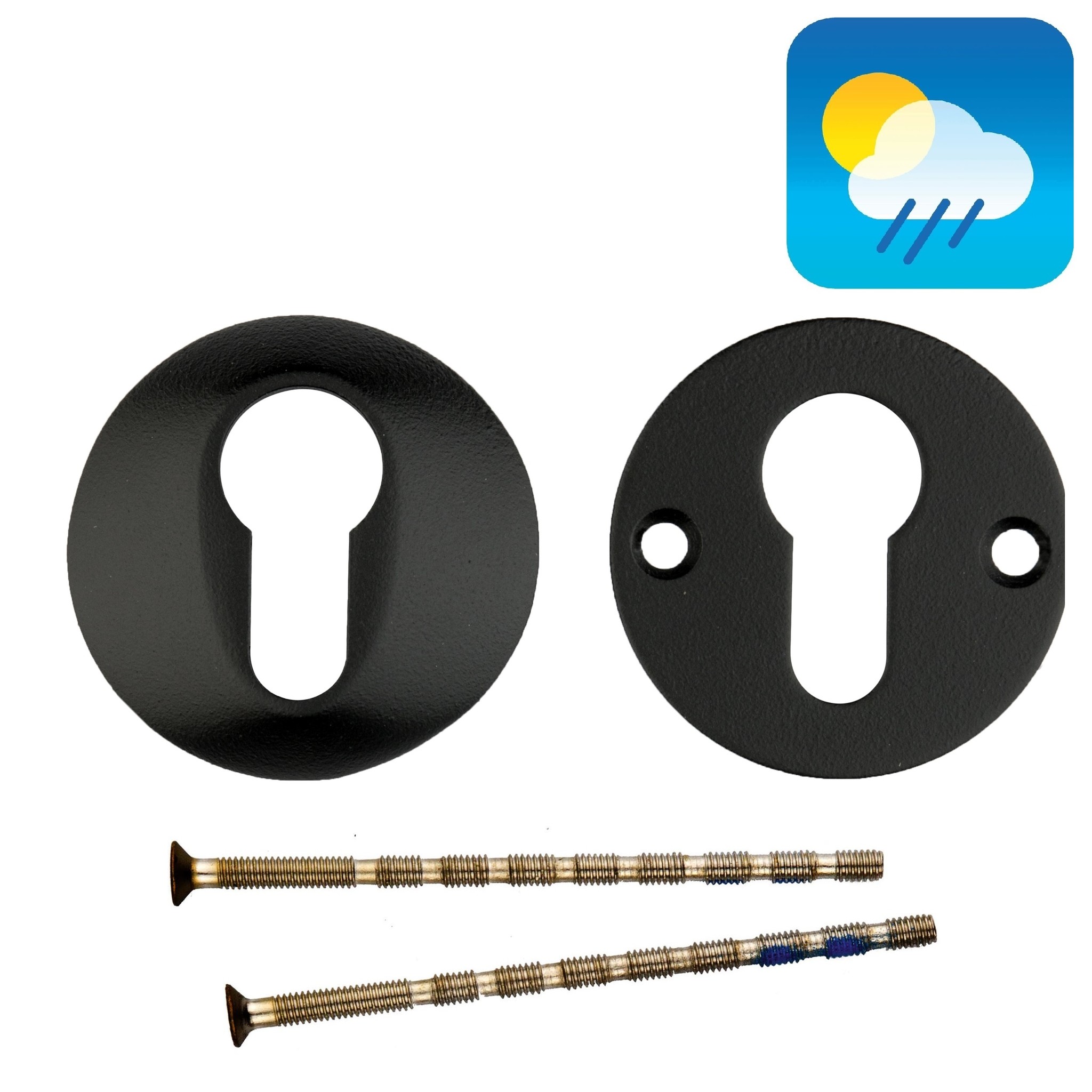 Le matériau de ces plaques de cylindre de sécurité est en acier inoxydable avec une peinture texturée noire mate résistante aux UV (RAL 9005).