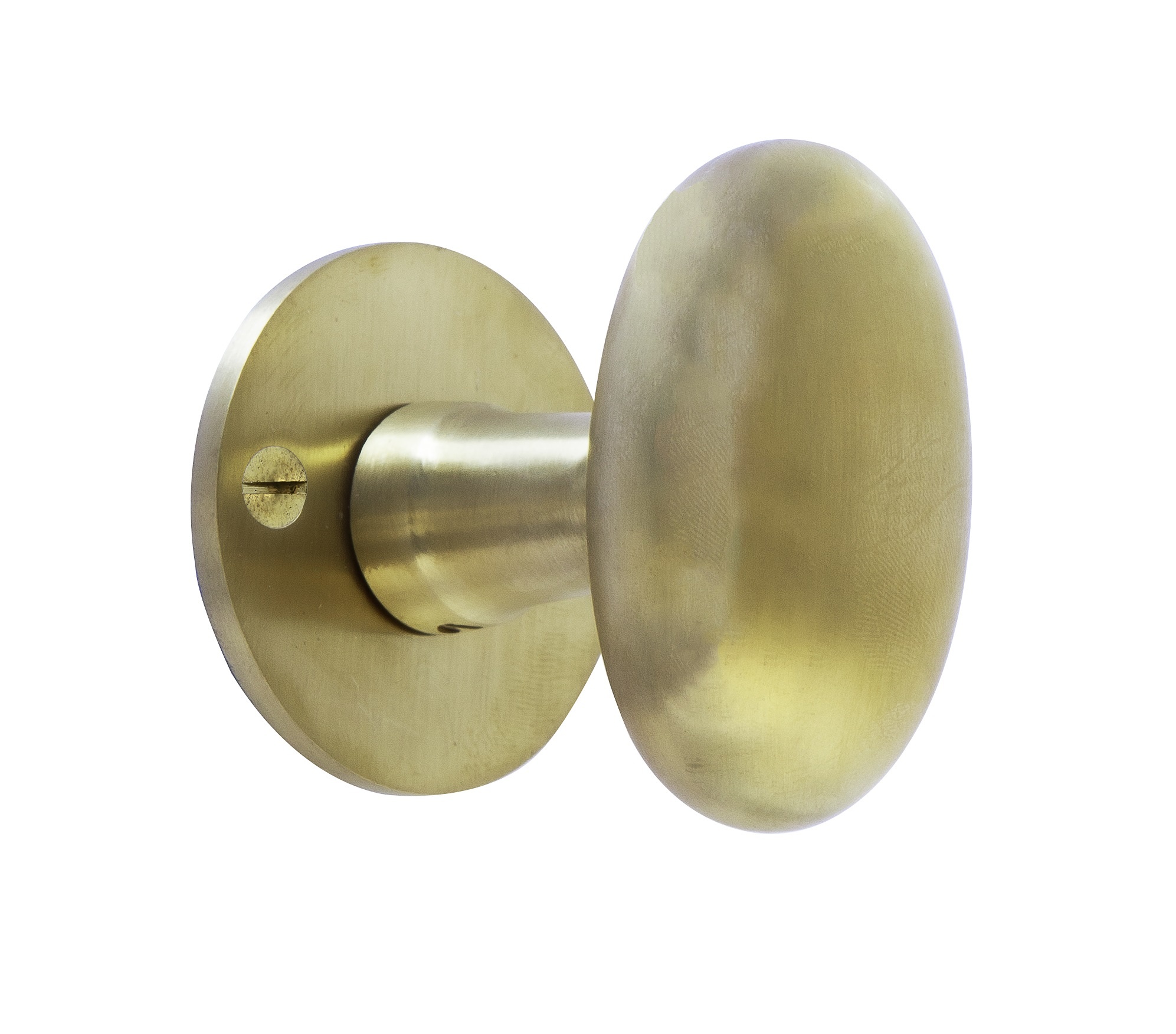 Ces boutons de porte à tambour ronds en forme de champignon de la collection CDL (Créations de Laiton) de Dauby reposent sur une rosace ronde d'un Ø de 52 mm et d'une épaisseur de seulement 4 mm. Les trous de vis sont déjà prévus dans la rosace et sont à un entraxe de 38 mm.