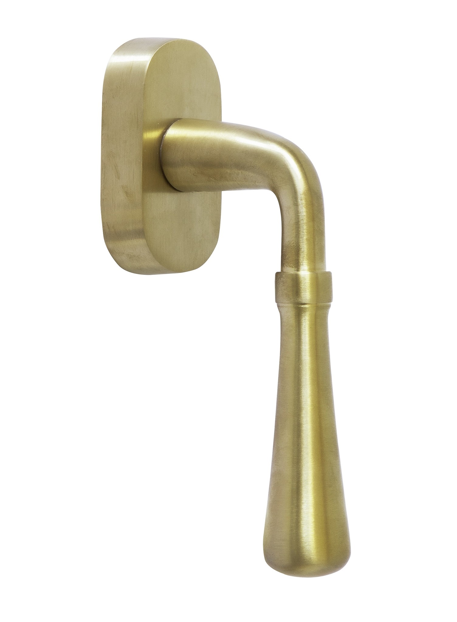 La poignée de fenêtre de la collection CDL (Créations de Laiton) repose sur une rosace ovale d'une hauteur de 68 mm qui dépasse de 15 mm.