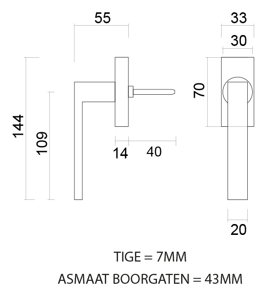 La poignée carrée en forme de L repose sur une rosace de 33X70mm.