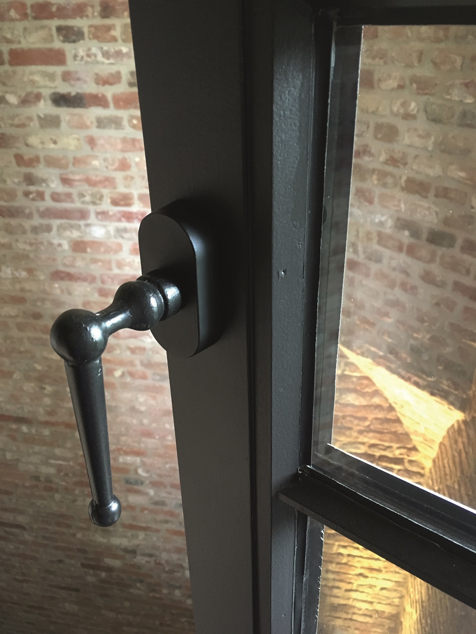 Ces poignées de fenêtre noires sont `` tombées '', créant une petite bosse. Cela donne à la poignée de la fenêtre un aspect plus ancien.