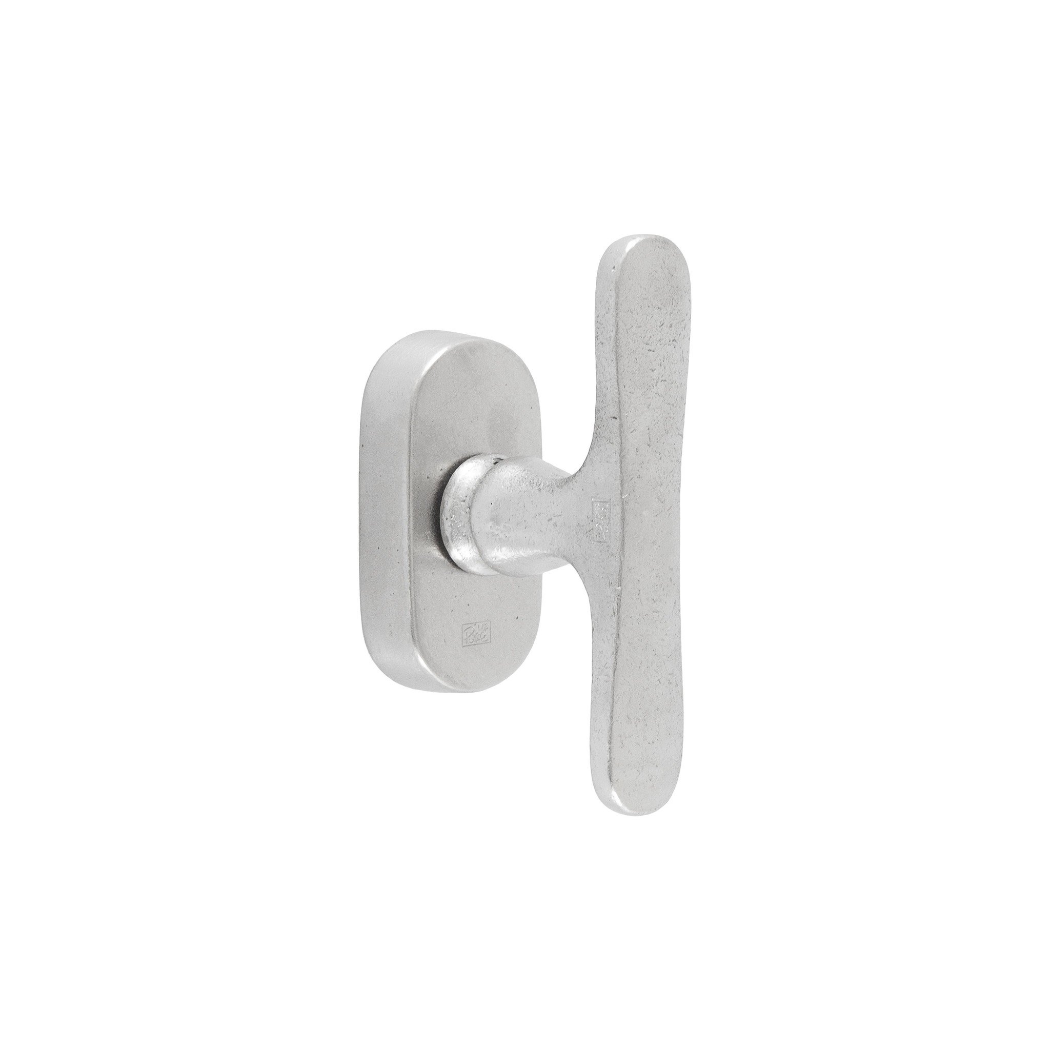 La poignée de fenêtre en bronze blanc mat en version oscillo-battante repose sur une rosace ovale d'une hauteur de 67 mm et d'une largeur de 35 mm.