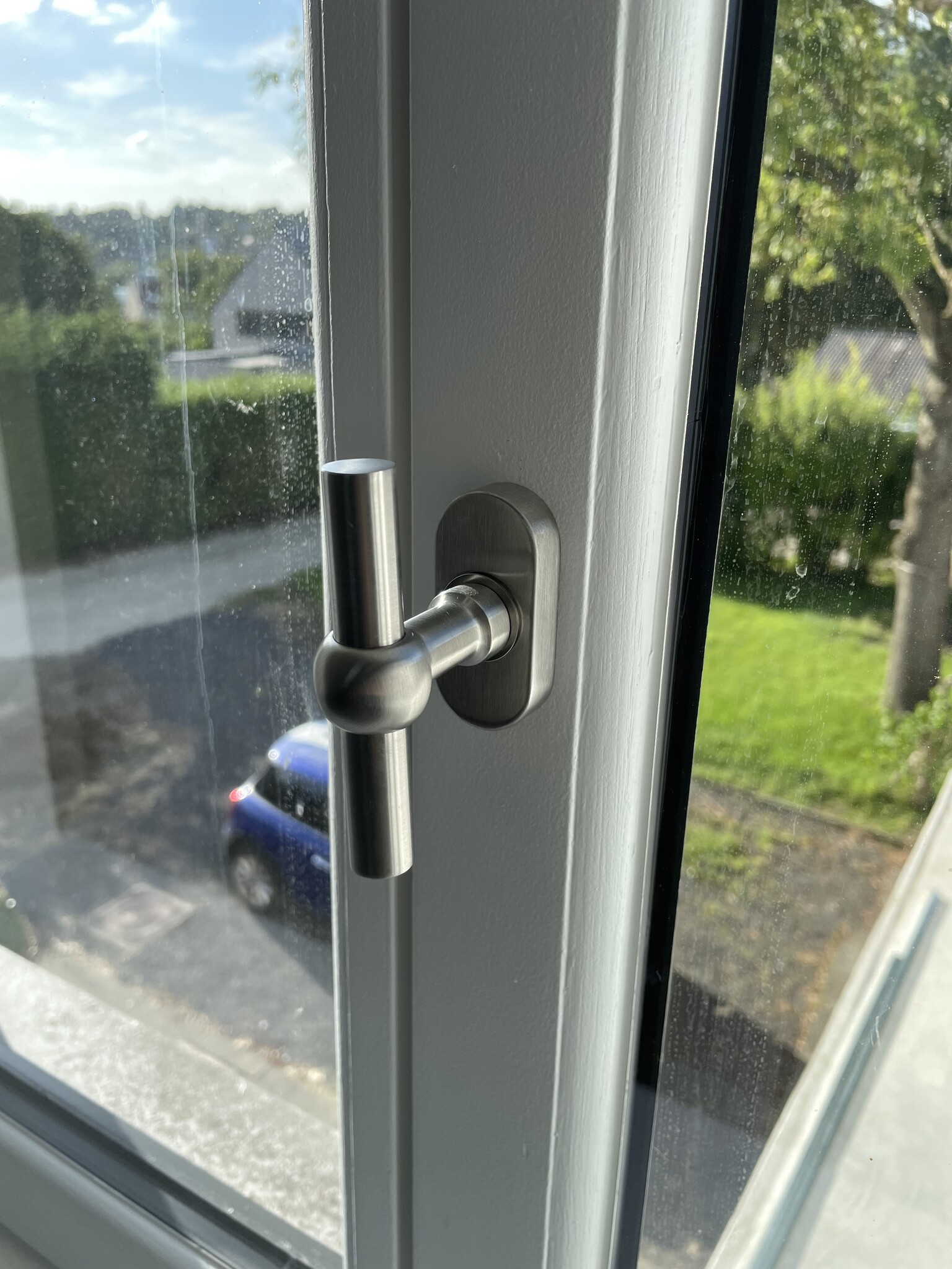 Poignée de fenêtre en acier inoxydable mat d'Intersteel sur une rosace ovale avec fonction d'inclinaison et de rotation en forme de T