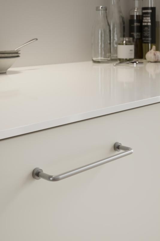 Poignée de meuble Furnipart LOUNGE avec une finition en acier inoxydable soyeuse disponible en 2 tailles d'axe différentes