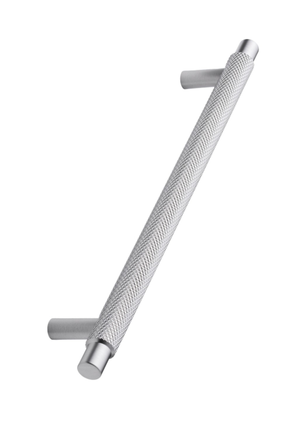 Cette poignée de meuble plus longue est fabriquée en aluminium et est ensuite recouverte d'un revêtement en poudre d'aspect acier inoxydable.