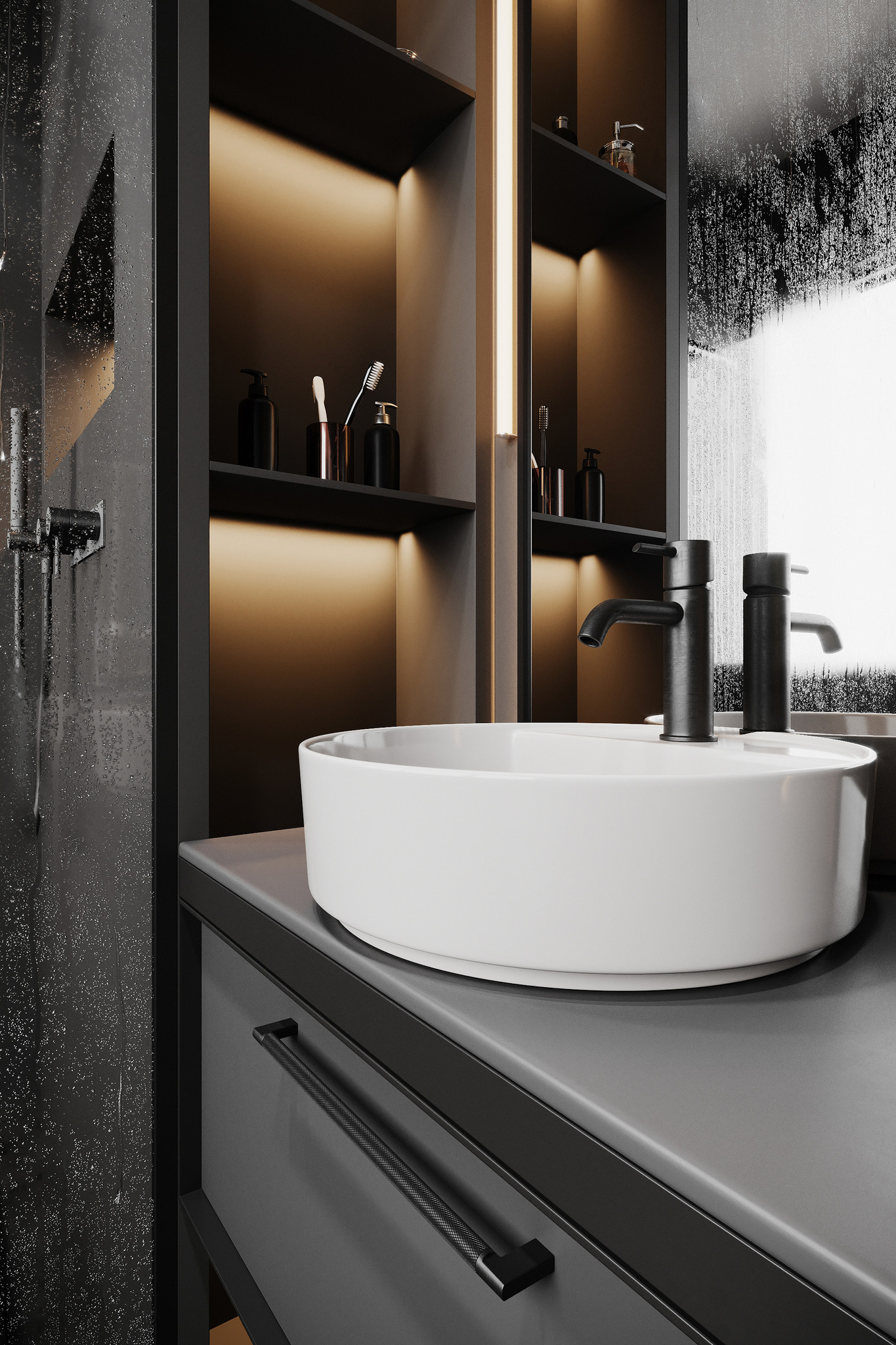 Cette longue poignée de meuble est en aluminium puis munie d'un revêtement noir qui est brossé pour obtenir l'aspect mat. Une caractéristique frappante de cette poignée de meuble moderne est le motif nervuré sur la poignée ronde. La poignée de meuble a un pied supplémentaire au milieu, de sorte qu'elle conserve sa robustesse malgré sa longueur.