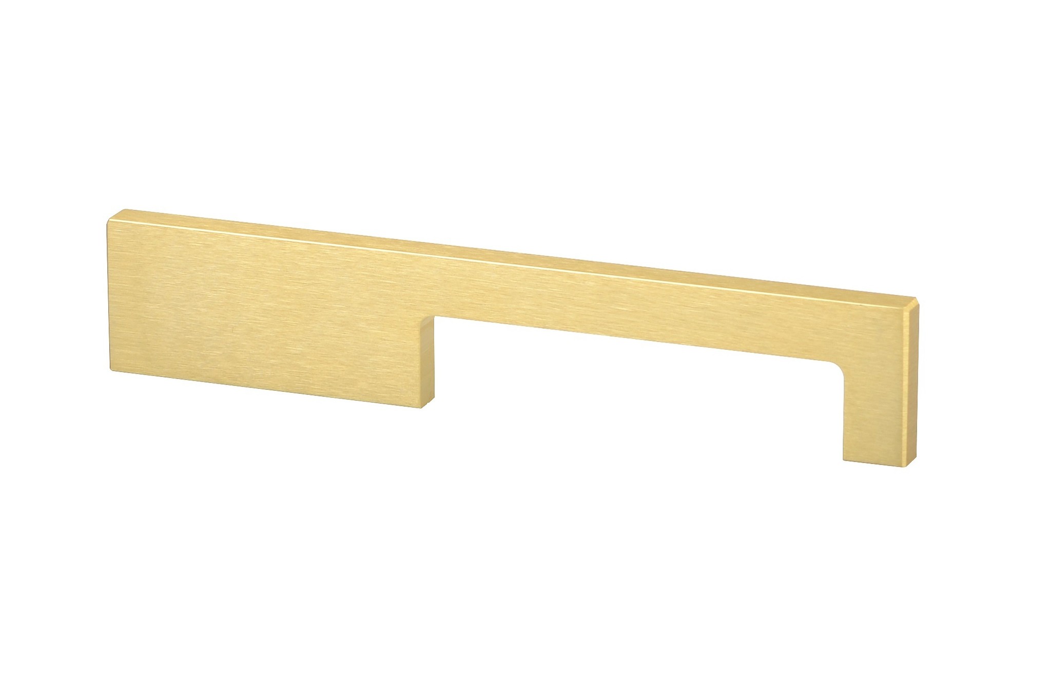 La poignée du meuble est en aluminium et ensuite dotée d'un revêtement final de couleur or massif qui est brossé pour obtenir l'aspect mat.