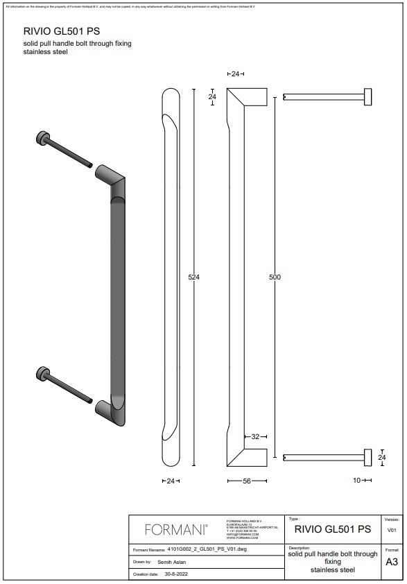 La poignée de porte à angle droit mesure 524 mm de long au total et dépasse de 56 mm. L'entraxe est de 500 mm.