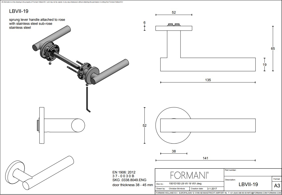 Les rosaces ont un diamètre de 52 mm et une épaisseur de seulement 6 mm . La longueur des poignées est de 135 mm. D'autres dimensions sont disponibles sur le dessin technique.