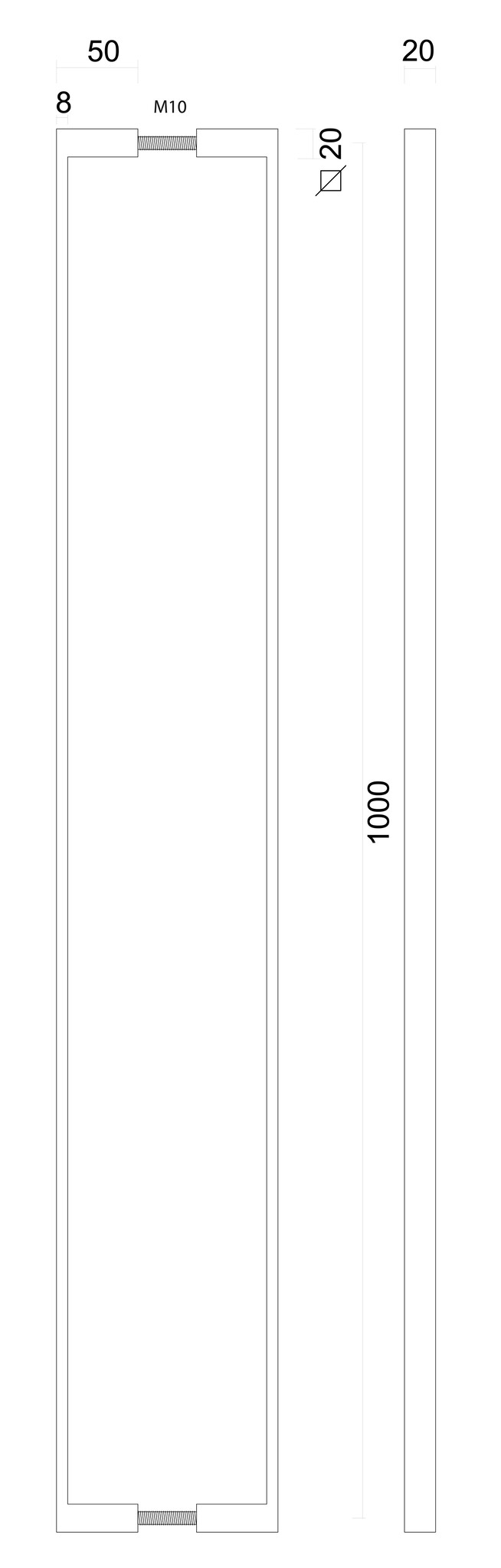 Les poignées de porte ont une taille d'axe de 1000 mm. La poignée de porte a un diamètre de 20 mm aux 2 points de fixation.