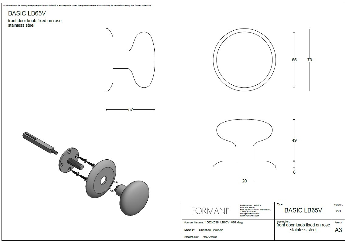Poignée de porte fixe en acier inoxydable massif, montée sur une rosace ronde avec un bouton rond, issue de la collection Basics de Formani. Cette poignée de porte fixe est montée en continu et convient à l'installation d'une poignée de porte intérieure.