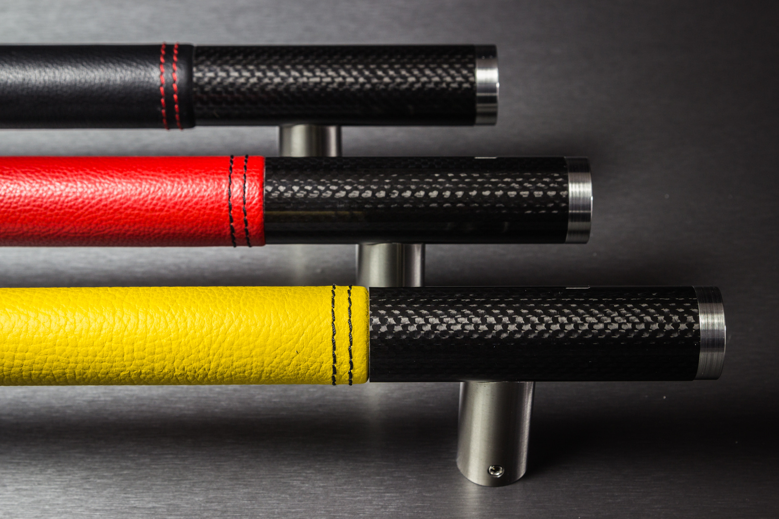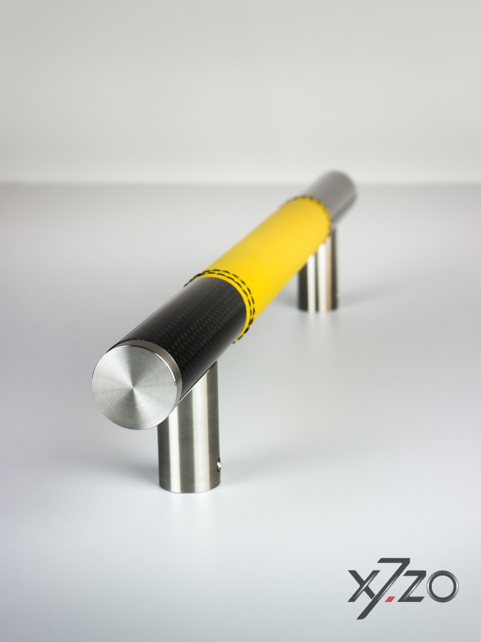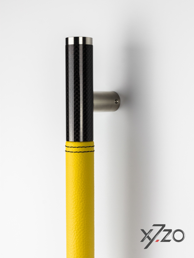 La poignée de porte moderne est en acier inoxydable combiné avec du carbone. Les pieds et les embouts de la poignée de porte sont en acier inoxydable. La poignée de porte elle-même est recouverte d'un revêtement en cuir italien jaune cousu à la main avec un fil noir. Il y a une protection en verre sur le carbone.