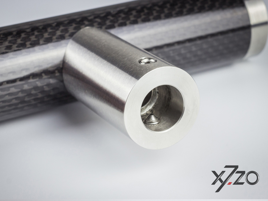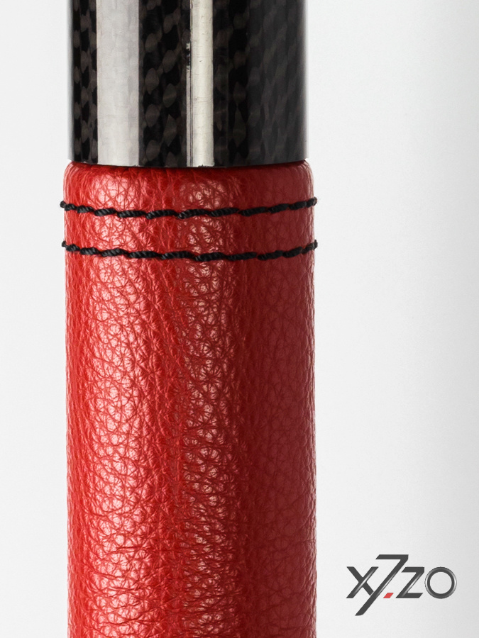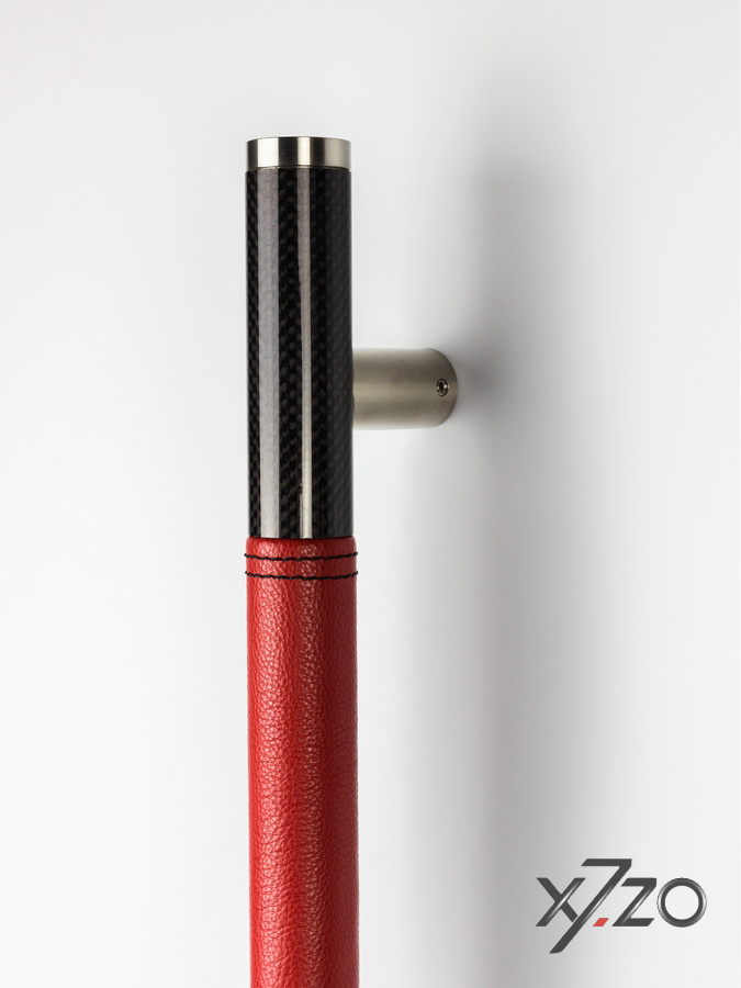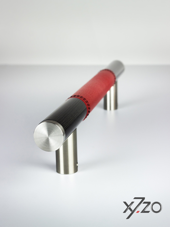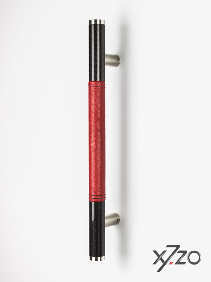 La poignée de porte moderne est en acier inoxydable combiné avec du carbone. Les pieds et les embouts de la poignée de porte sont en acier inoxydable. La poignée de porte elle-même est recouverte d'un revêtement en cuir italien rouge cousu à la main avec un fil noir. Il y a une protection en verre sur le carbone.