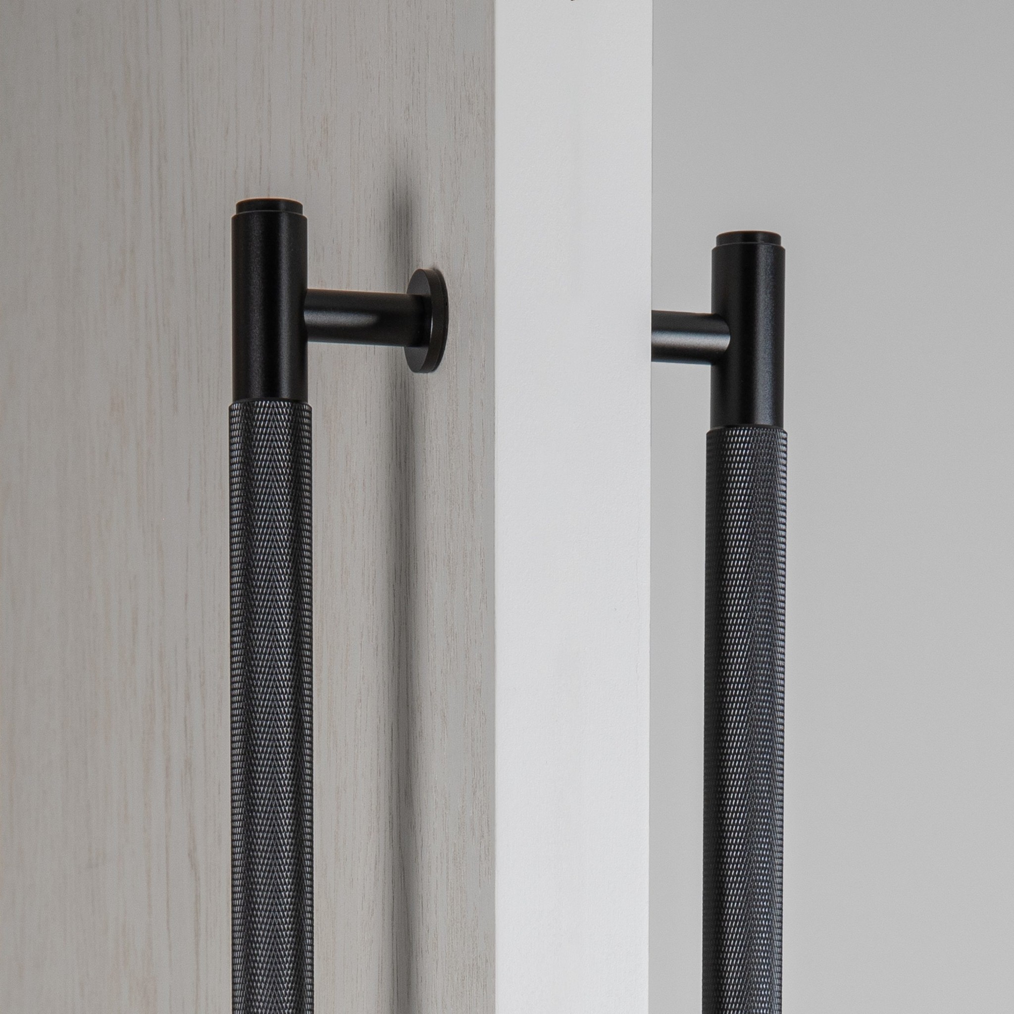 Une paire de poignées de porte solides noires à double face. Ces poignées de porte présentent le motif de croix en forme de diamant emblématique de Buster&Punch et ont été affinées à la main.