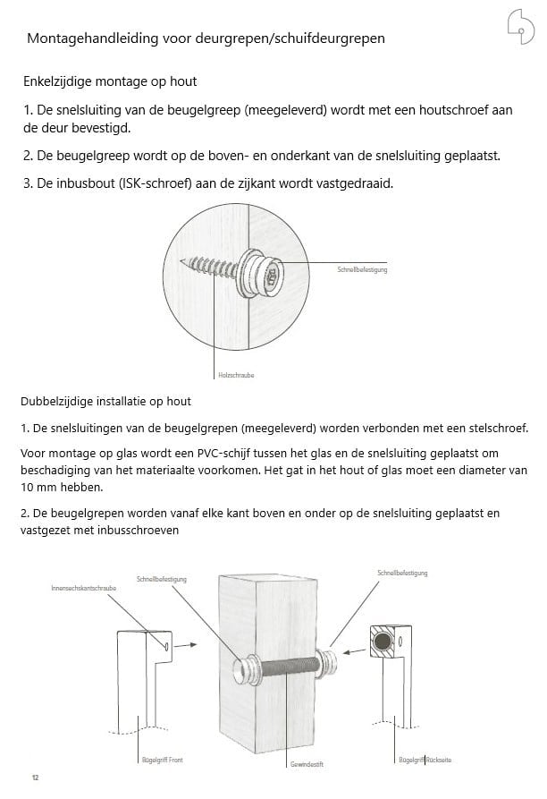 Ces poignées de porte peuvent être montées soit en aveugle, soit en continu, selon votre préférence ou le style de votre intérieur. A cet effet, nous fournissons avec chaque poignée de porte (livrée à l'unité) : 2x tige filetée M8x80mm, 2x tige filetée M8x40mm, 4x une douille en laiton M8 avec fixation M8. (voir les instructions de montage avec les images)