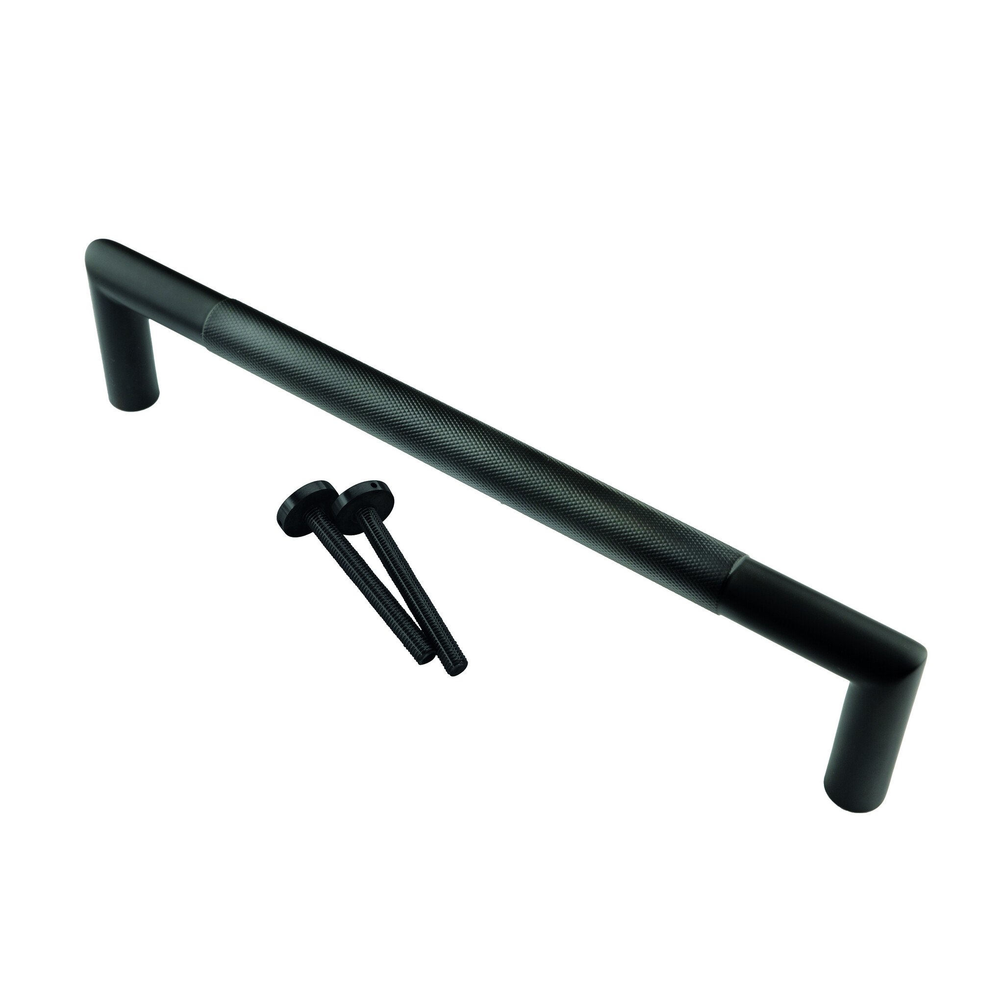 Poignée de porte moderne ronde noire en forme de U avec des angles droits élégants. Le manche a un motif croisé. Pour une utilisation en intérieur uniquement