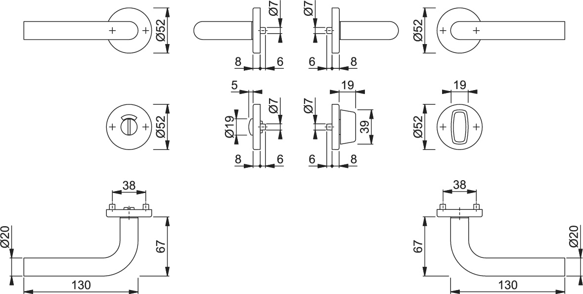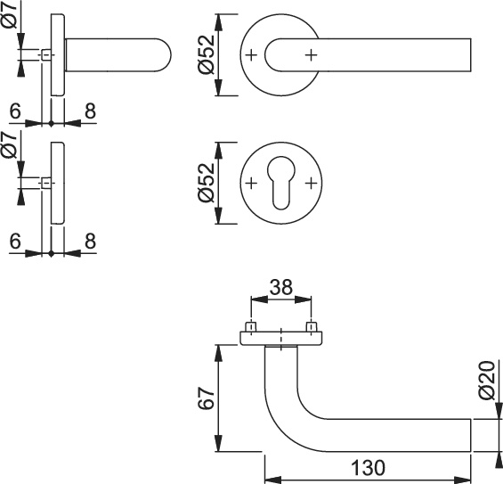 Les poignées de porte sont disponibles avec des plaques à clés, avec des plaques à cylindre ou avec une ferrure pour toilettes. Faites votre choix dans le menu déroulant en haut à droite.