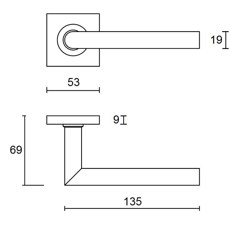 Ces poignées de porte en inox sont montées sur des rosaces carrées (diamètre 53 mm).