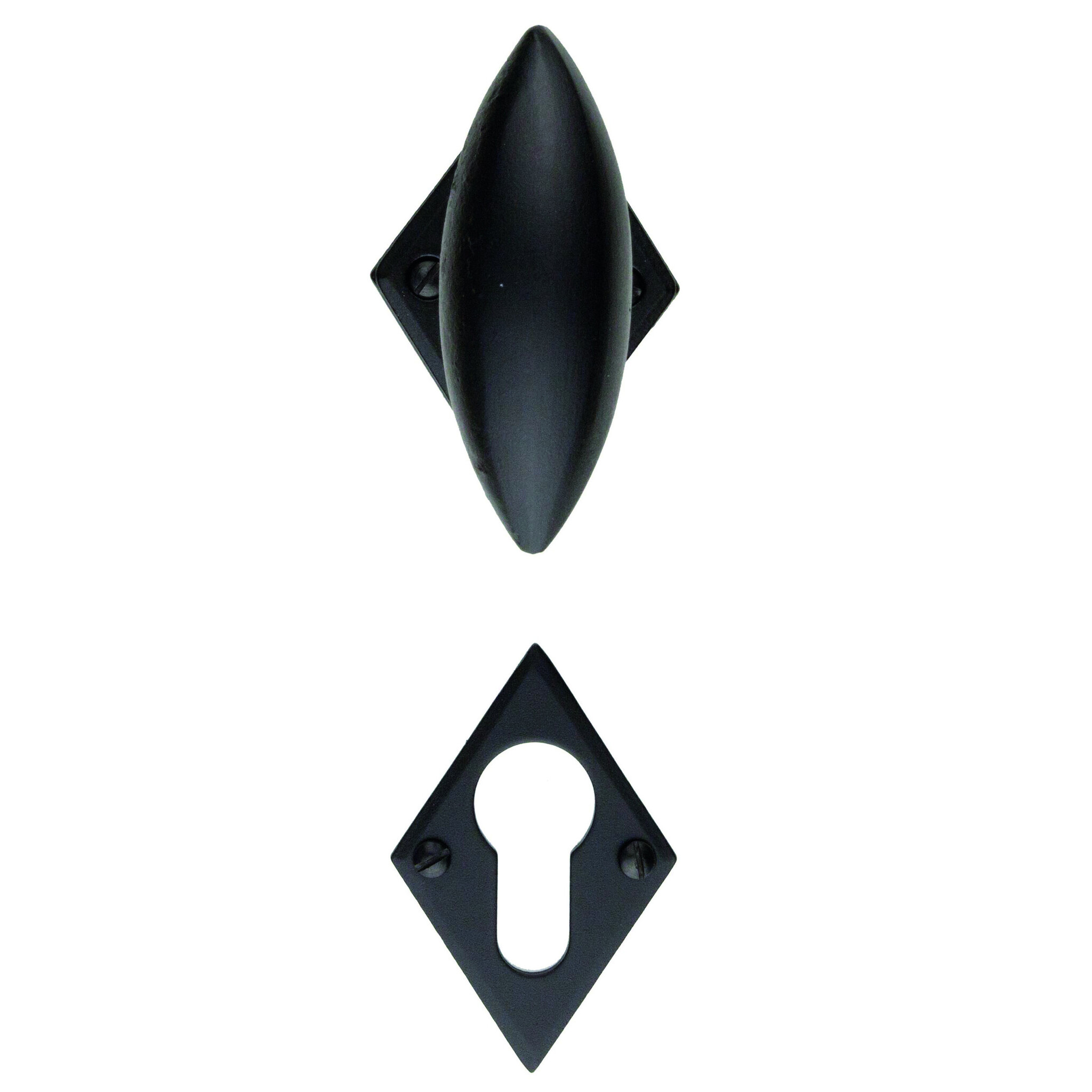 La poignée de porte Olina a un aspect noir mat avec une structure et une forme rétro, fournie sur une rosace en forme de losange.