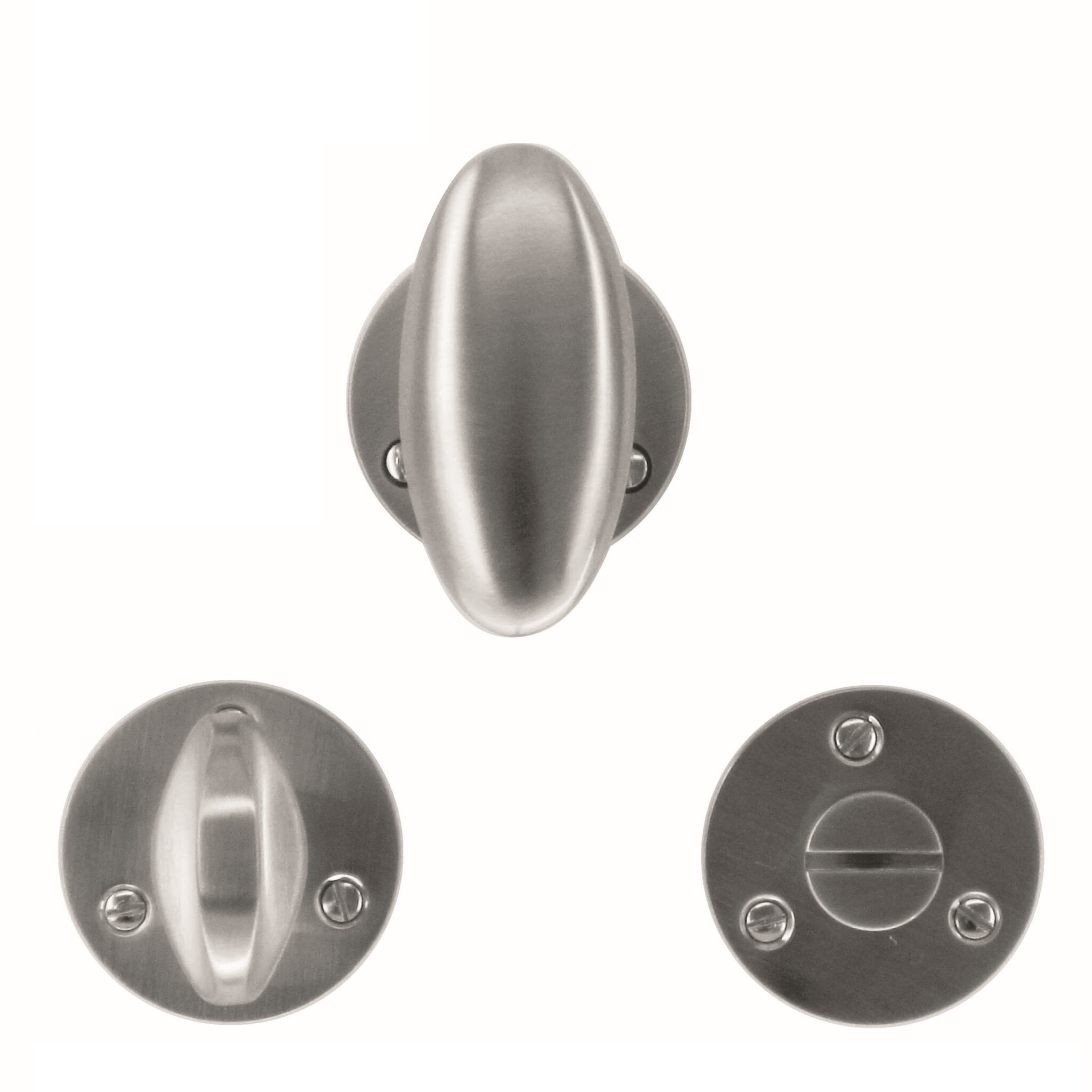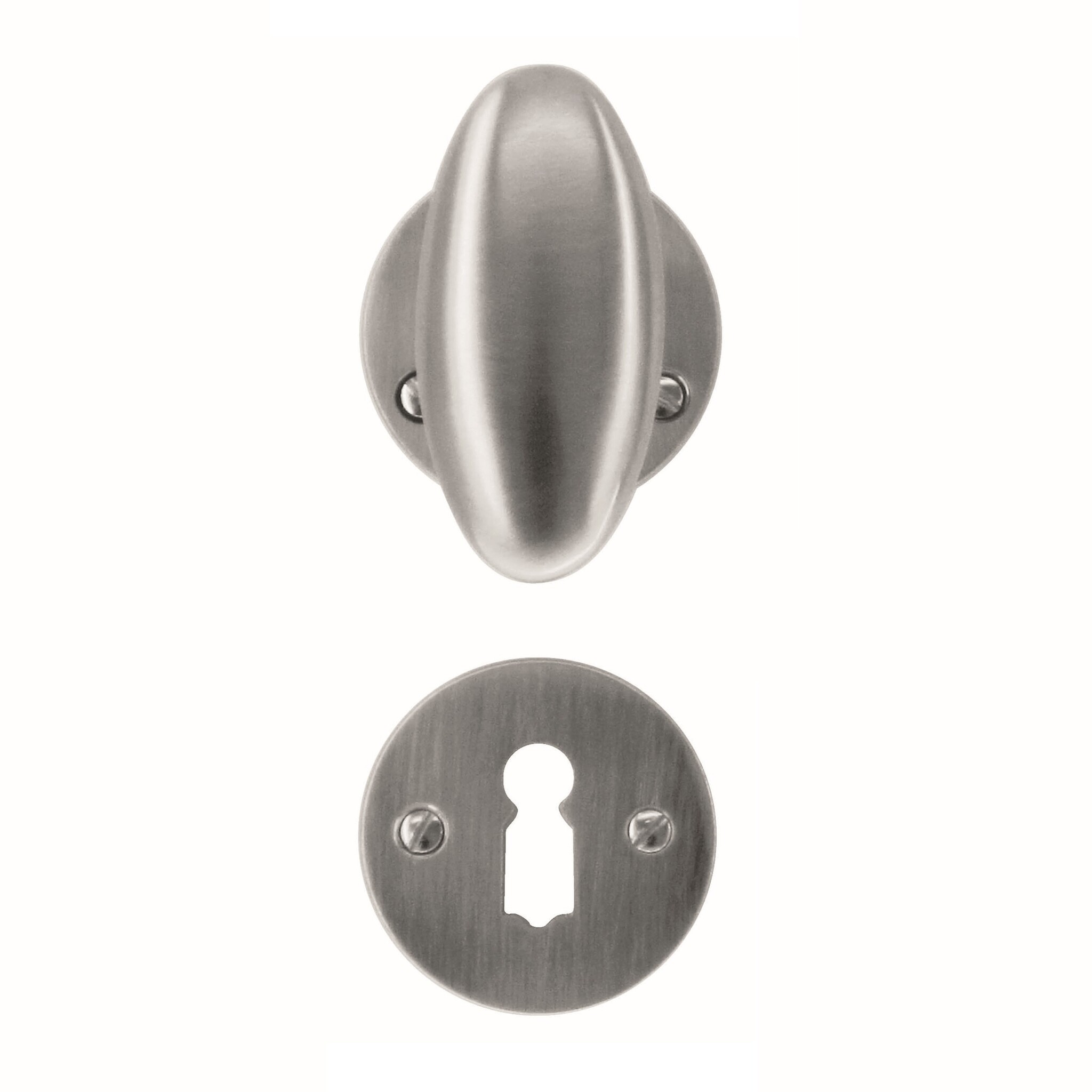 Poignée de porte pleine aspect inox 'Olive' sur rosace ronde disponible en 4 versions