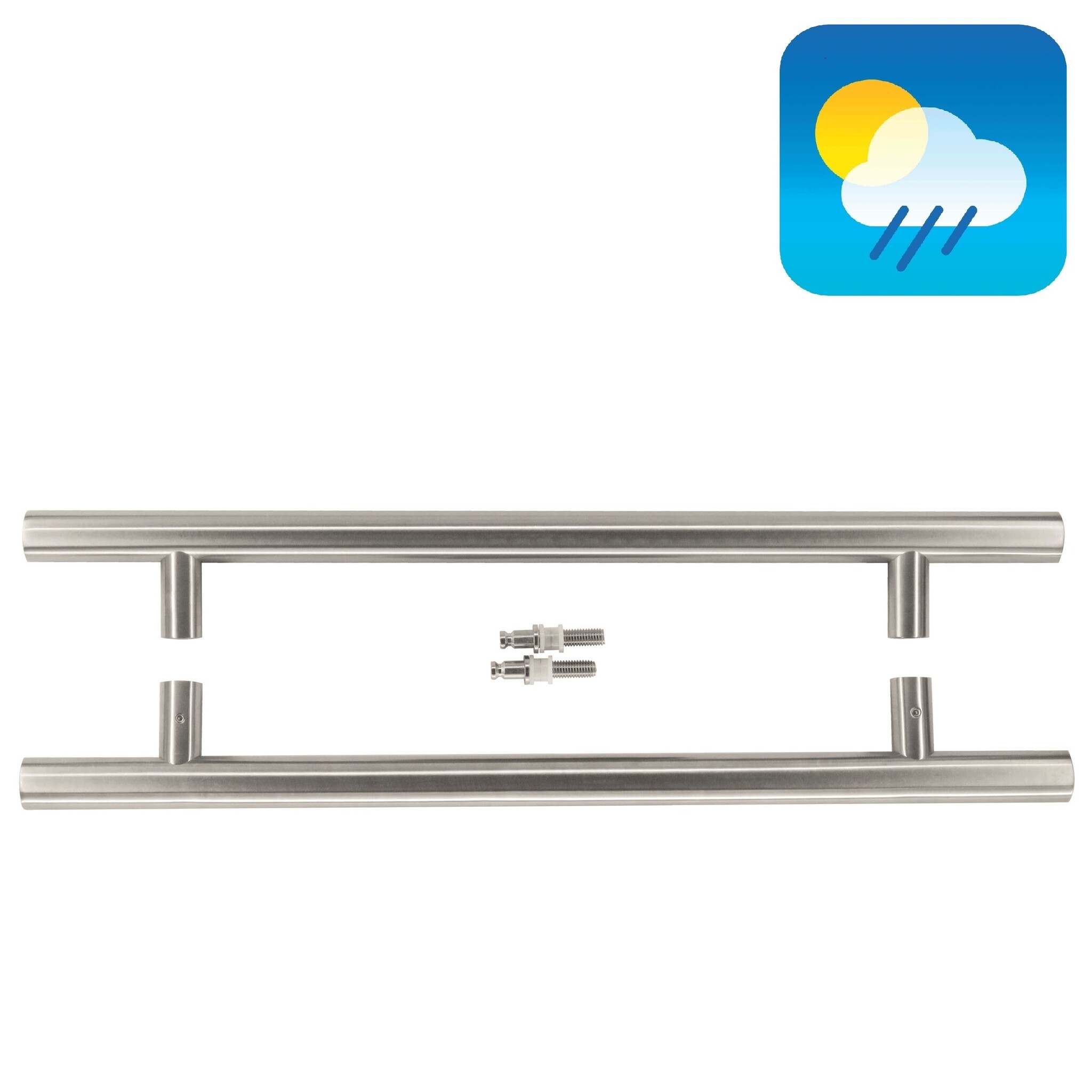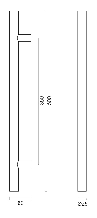 Poignées de porte modernes en acier inoxydable en forme de T pour le montage sur des portes en verre d'une longueur de 500 mm. Ces poignées de porte en acier inoxydable ont un diamètre de 25 mm et une taille d'axe de 350 mm. Les poignées de porte dépassent de 60 mm de chaque côté.