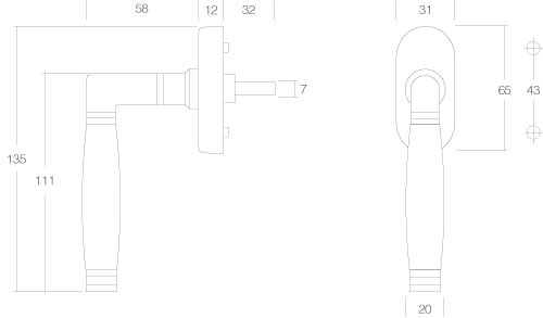 Ces poignées de fenêtre en nickel ont une belle poignée en forme de poire d'une épaisseur maximale de 20 mm. Le tabouret repose sur une rosace ovale d'une hauteur de 65 mm, d'une largeur de 31 mm qui dépasse de 12 mm. Les trous de montage sont espacés de 43 mm.