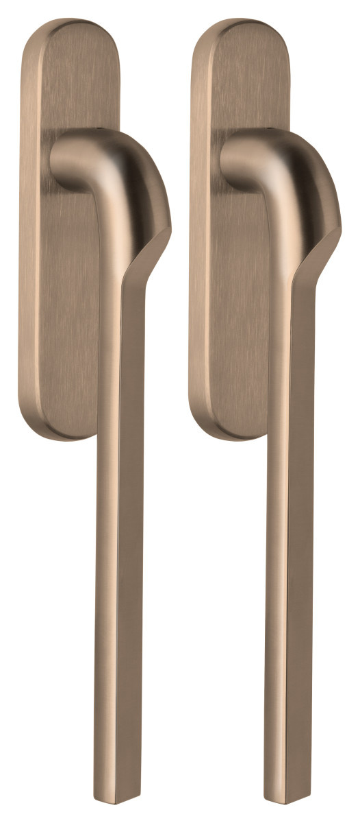 À l'intérieur comme à l'extérieur, la poignée en forme de L, en PVD bronze clair, de 230 mm de long et 24 mm de diamètre, est montée sur un écusson ovale. Cet écusson mesure 151 mm de haut, 32 mm de large et s'étend sur 13 mm vers l'avant.