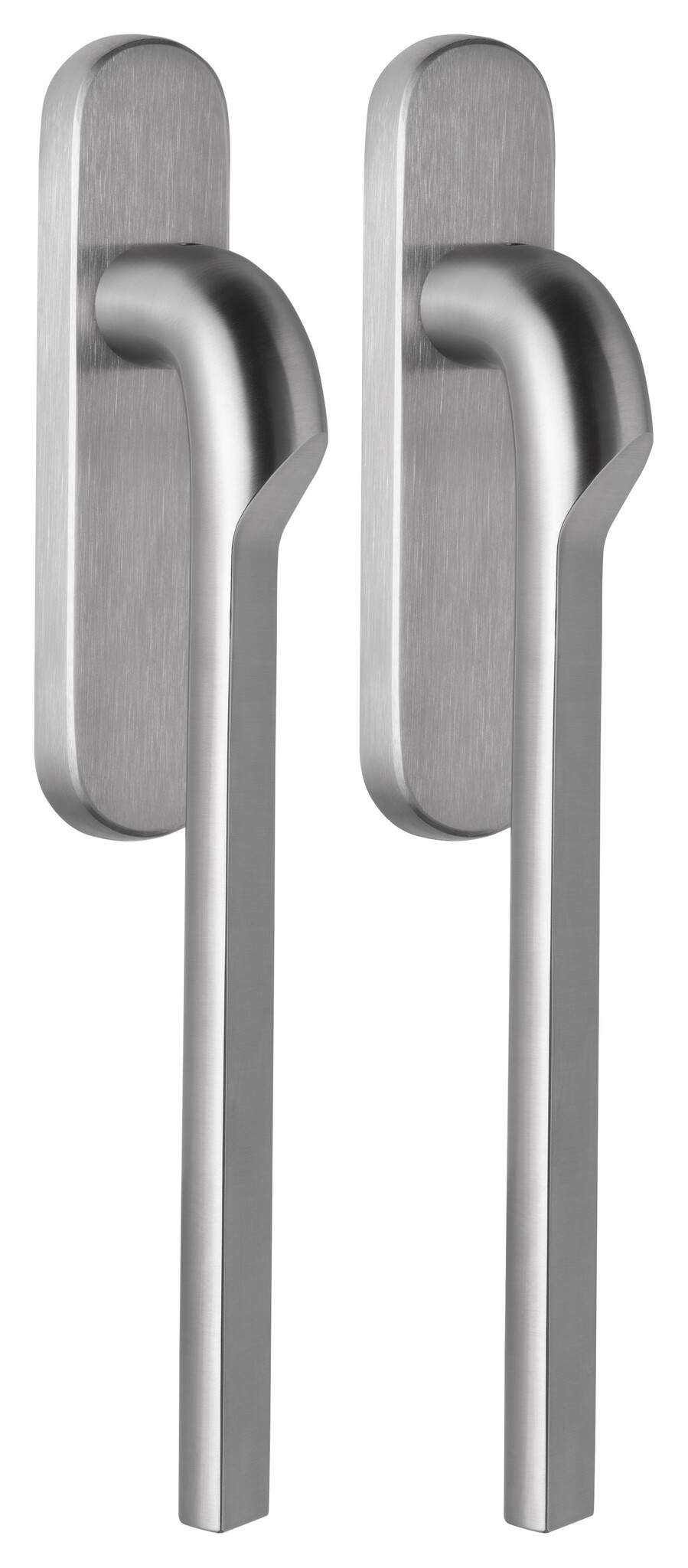 La poignée en acier inoxydable en forme de L, de 230 mm de long et 24 mm de diamètre, est fixée à l'intérieur et à l'extérieur sur un écusson ovale. Cet écusson mesure 151 mm de haut, 32 mm de large et dépasse de 13 mm vers l'avant.