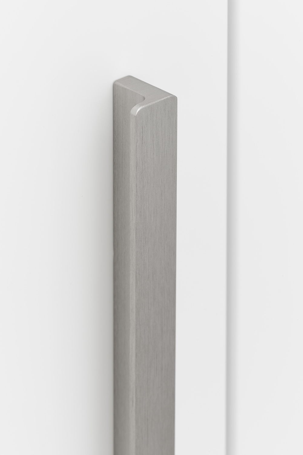 Poignées de meubles conçues par VE2 pour Furnipart en aluminium et finies avec un revêtement aspect acier inoxydable. Disponible en 2 longueurs