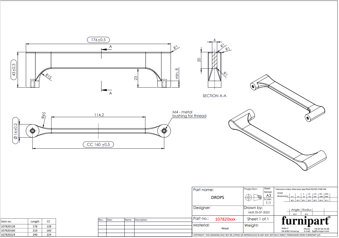 Les poignées des meubles en bois sont enfin finies avec une couche de vernis. Les trous de montage sont pourvus de douilles filetées métalliques (M4).