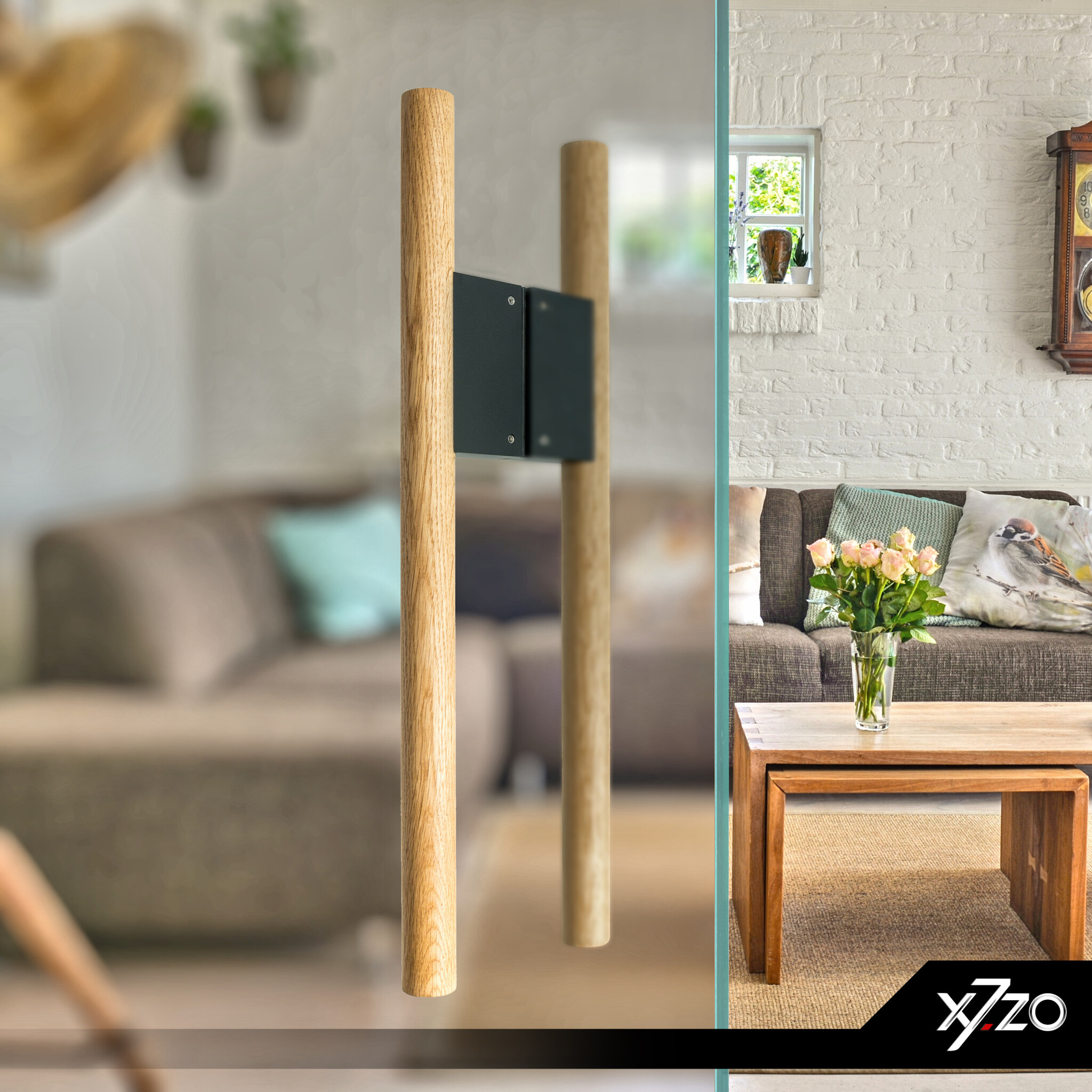 Ces belles poignées de porte, produites en Europe, sont une combinaison d'une poignée de porte en chêne sur une base en aluminium noir.