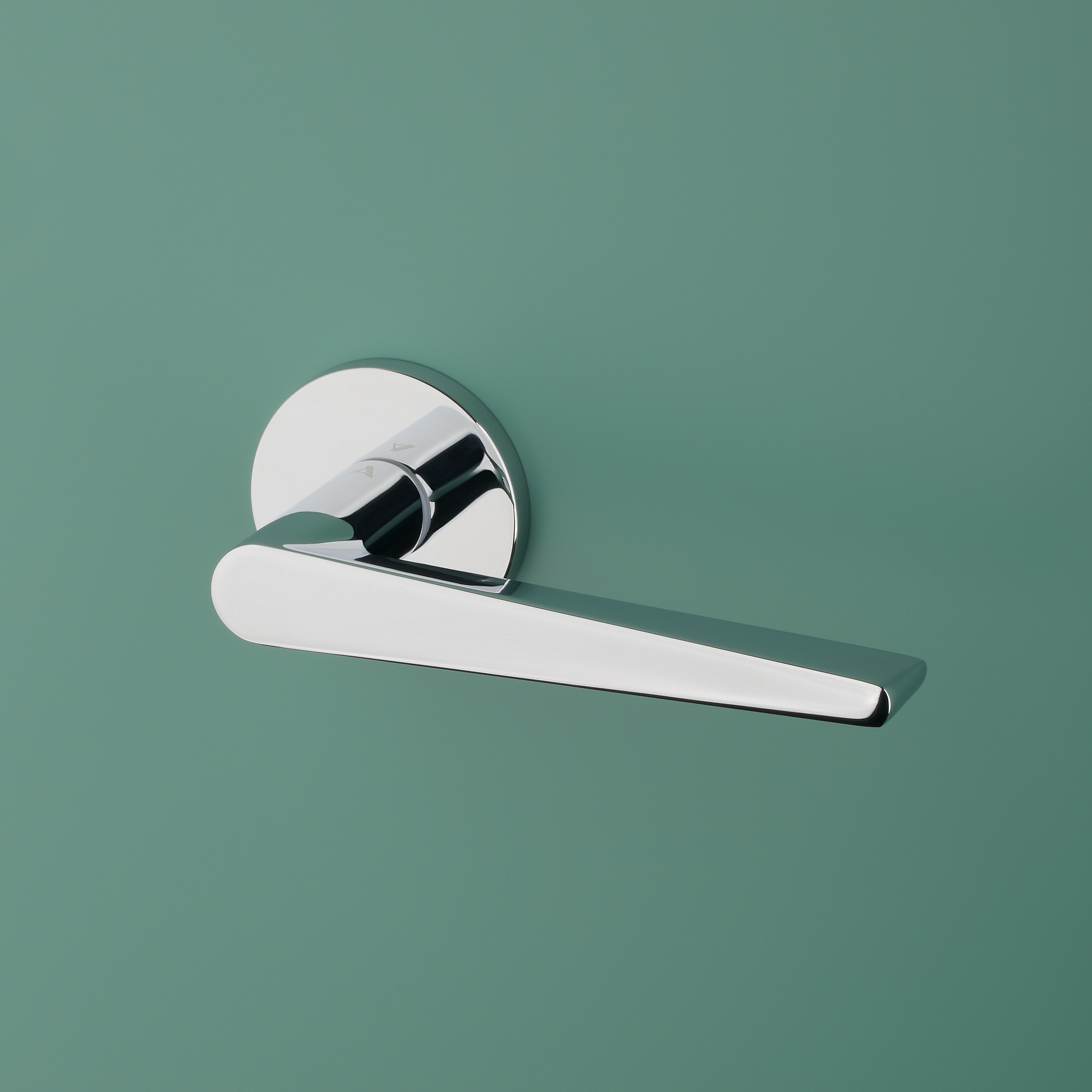 Ces poignées de porte solides Aprile reposent sur des rosaces rondes Ø53 et ont une épaisseur de seulement 7 mm.