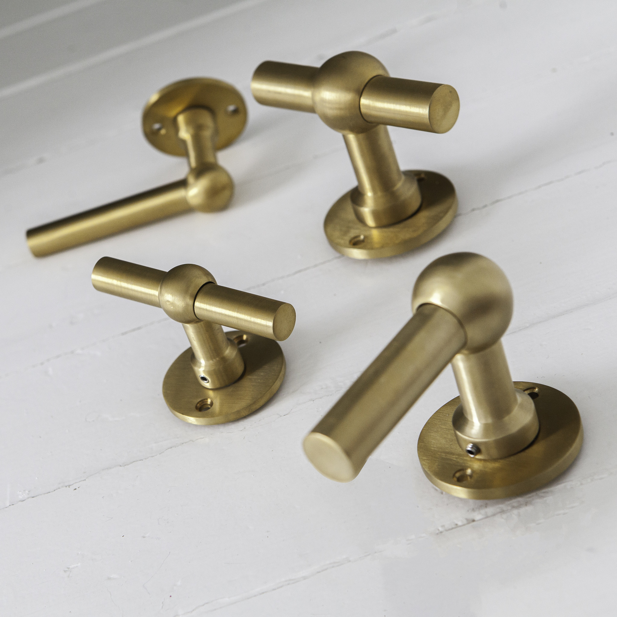 Ces poignées de porte en forme de T à bouton sphérique de la collection CDL (Créations de Laiton) de Dauby reposent sur une rosace ronde de Ø 52 mm d'une épaisseur de seulement 4 mm. Les trous de vis sont déjà prévus dans la rosace et sont à un entraxe de 38 mm.