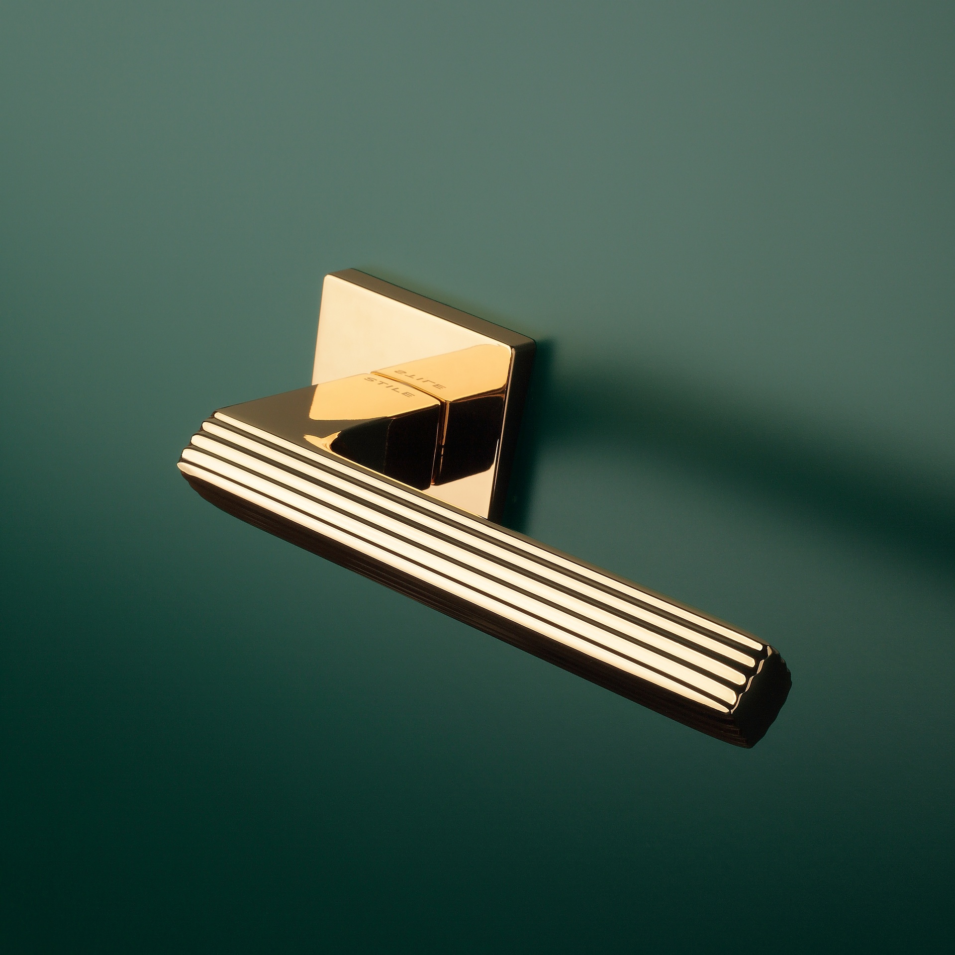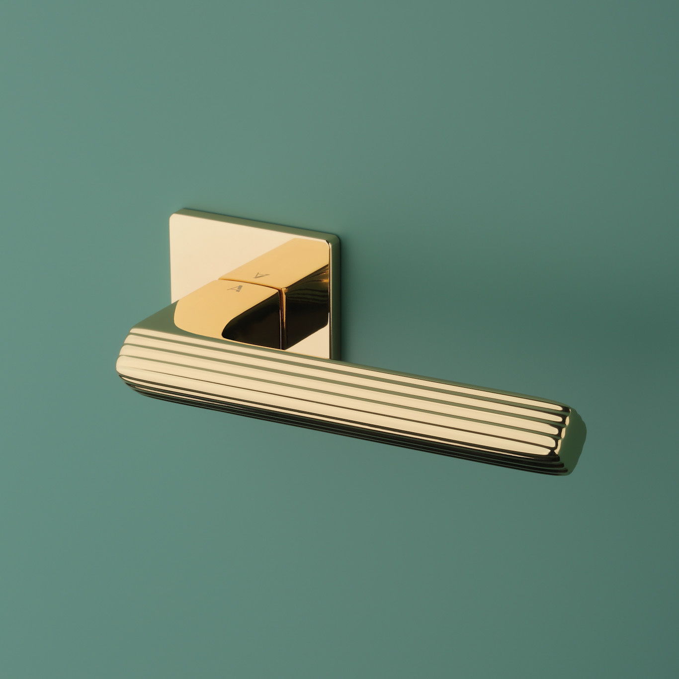 Ces poignées de porte au design exclusif ont une apparence très particulière grâce aux rainures allongées sur tout le pourtour et à une finition dorée polie.