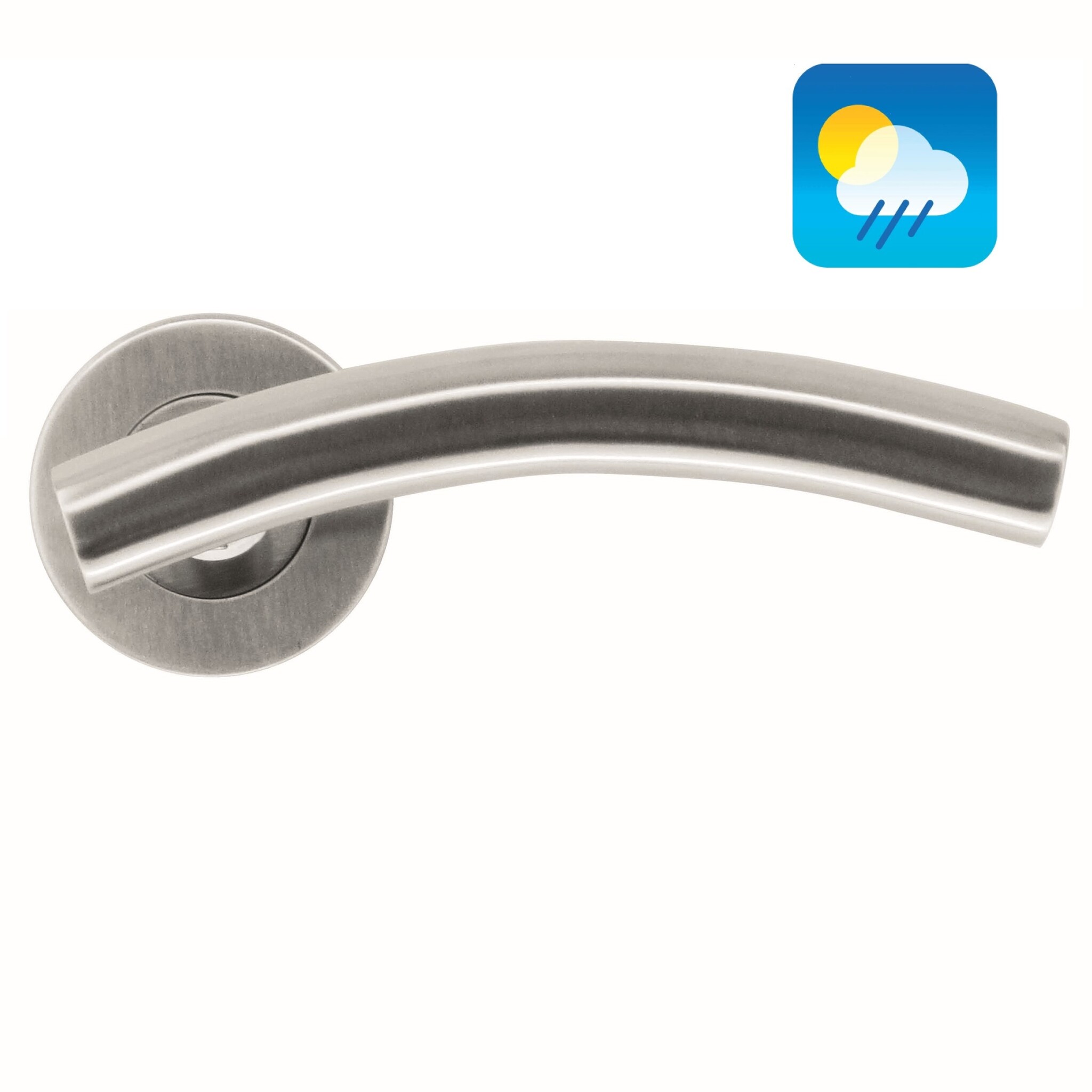 Poignées de porte en acier inoxydable « forme GT 19 mm » sur rosaces rondes et adaptées à une utilisation extérieure, disponibles en 4 versions