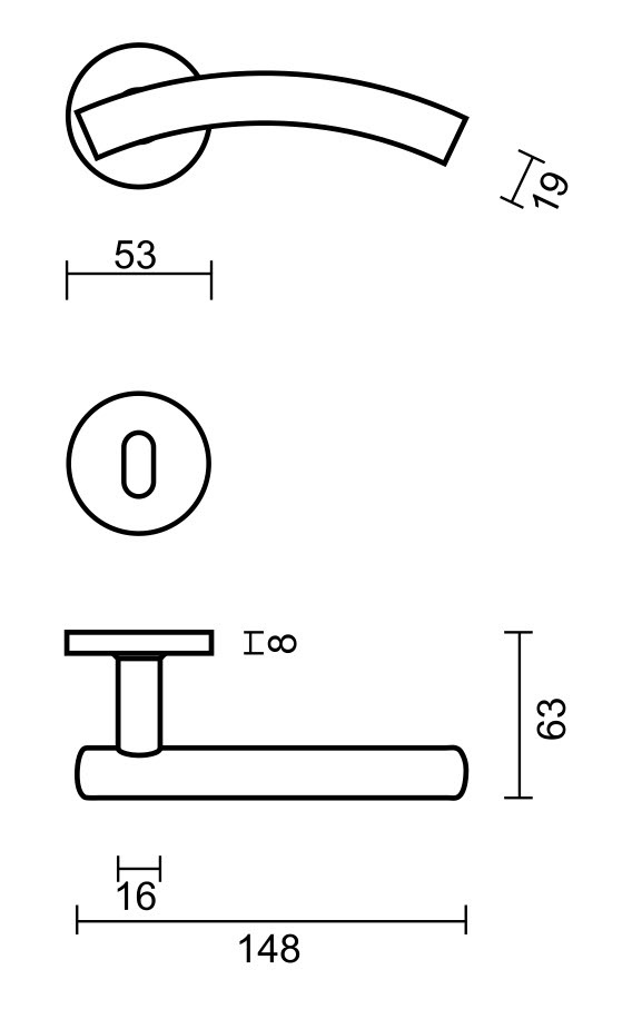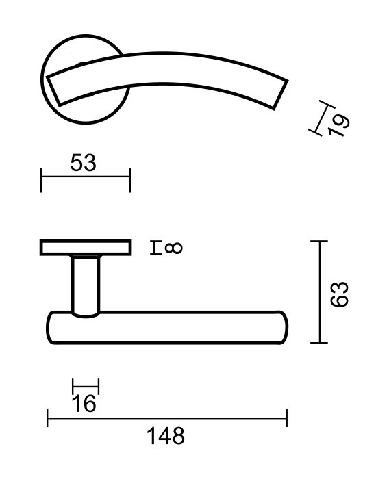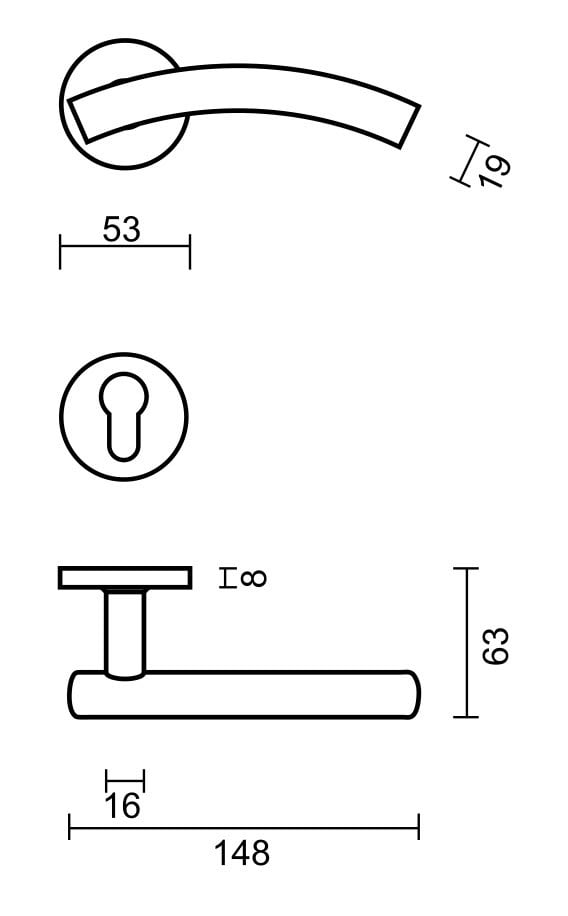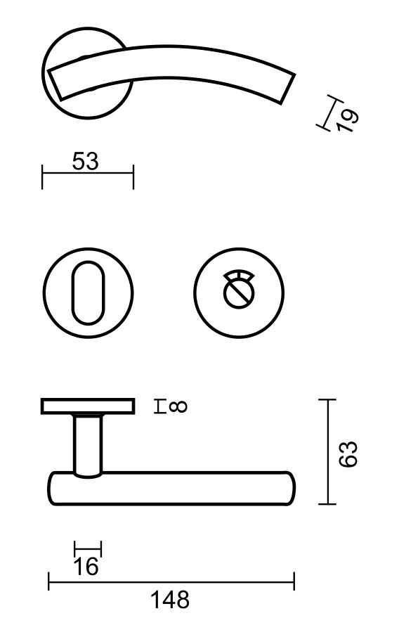 Les poignées de porte sont à ressort et sont montées sur une rosace de 55x8 mm.