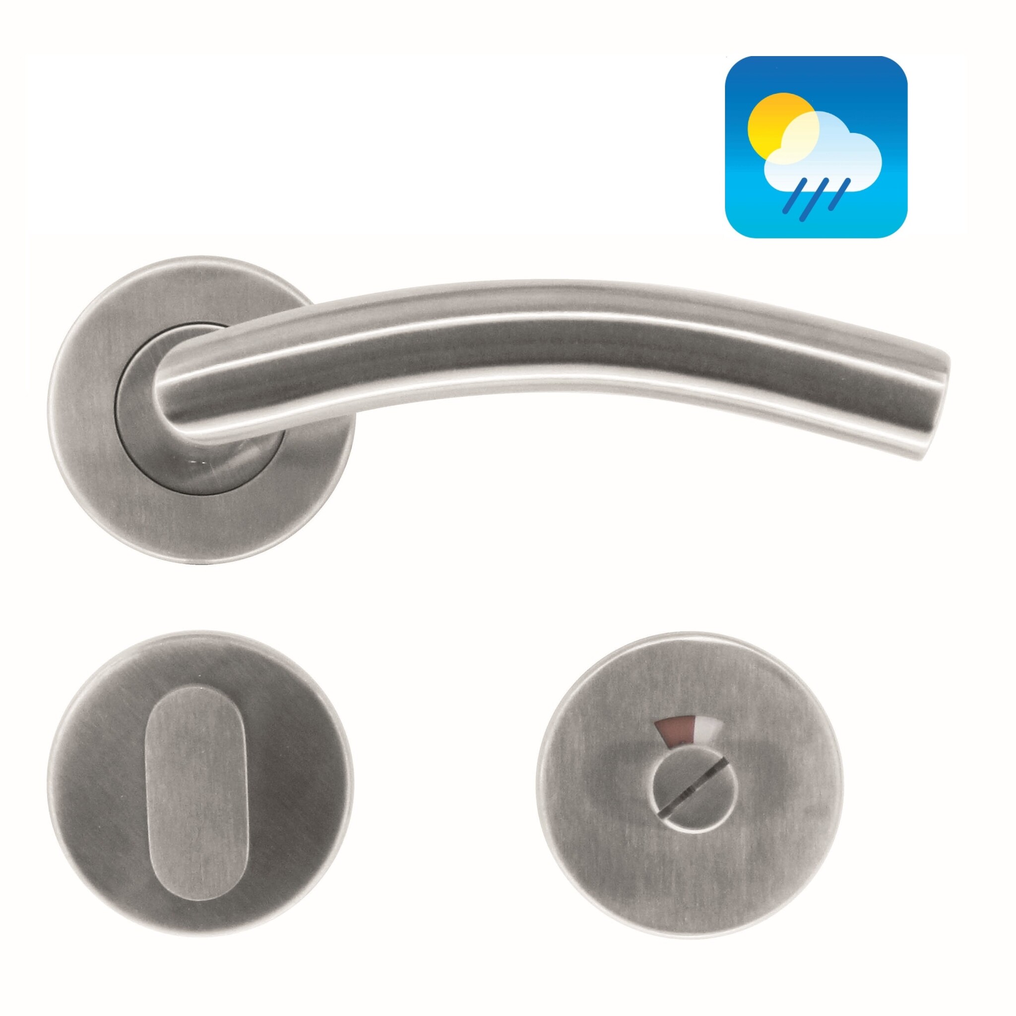 Poignées de porte en acier inoxydable de forme GI sur rosaces rondes et adaptées à une utilisation extérieure, disponibles en 4 versions