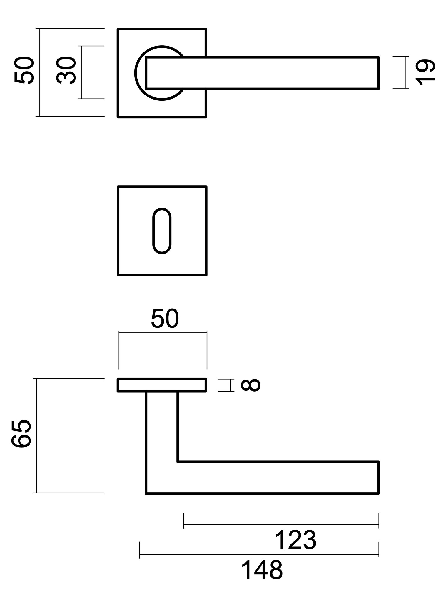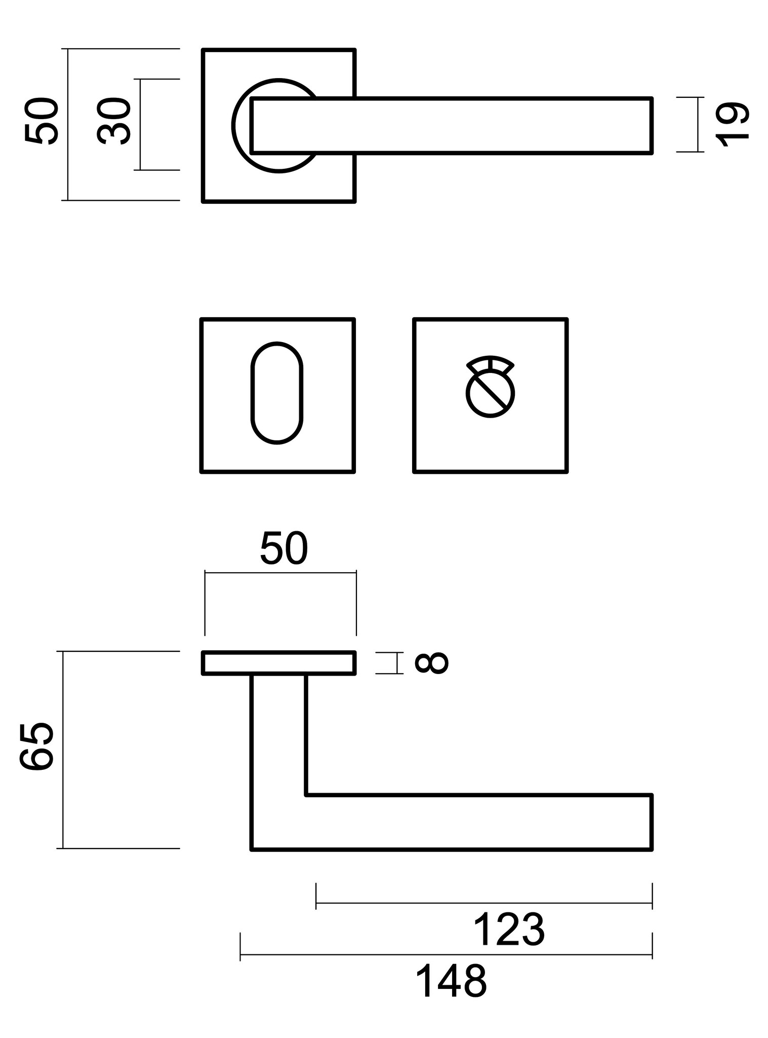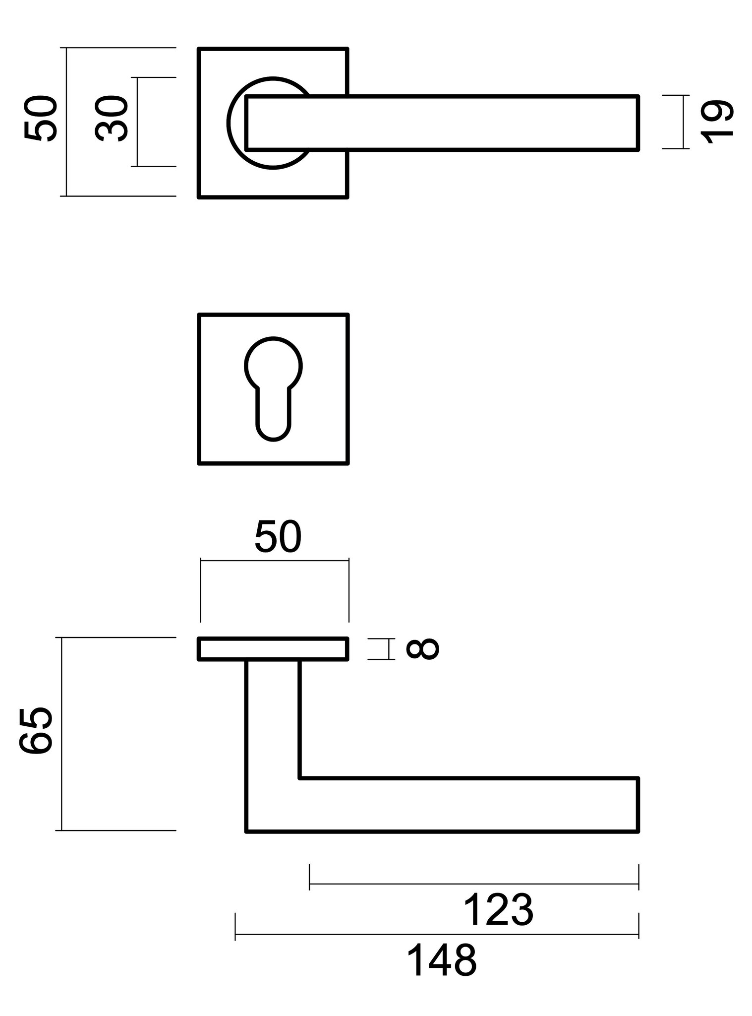 Description Poignées de porte en acier inoxydable, forme cubique 19 mm, sur rosace carrée, également adaptées à une utilisation extérieure et disponibles en 4 versions différentes.