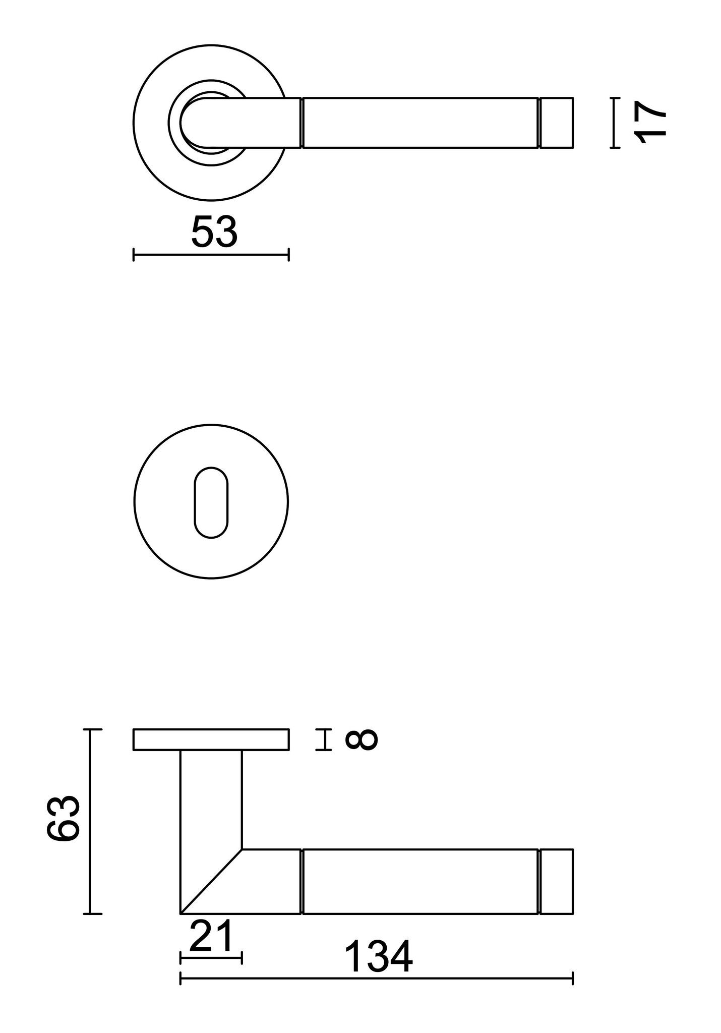 Les poignées de porte sont à ressort, montées sur une rosace ronde de 53 x 8 mm et dotées d'une rosace inférieure en plastique. Elles conviennent donc également à une utilisation en extérieur .