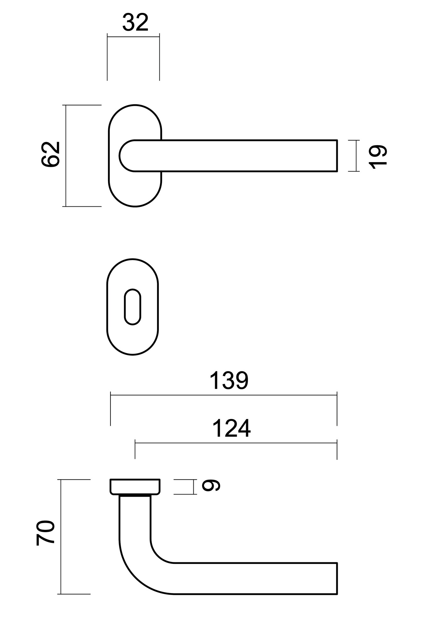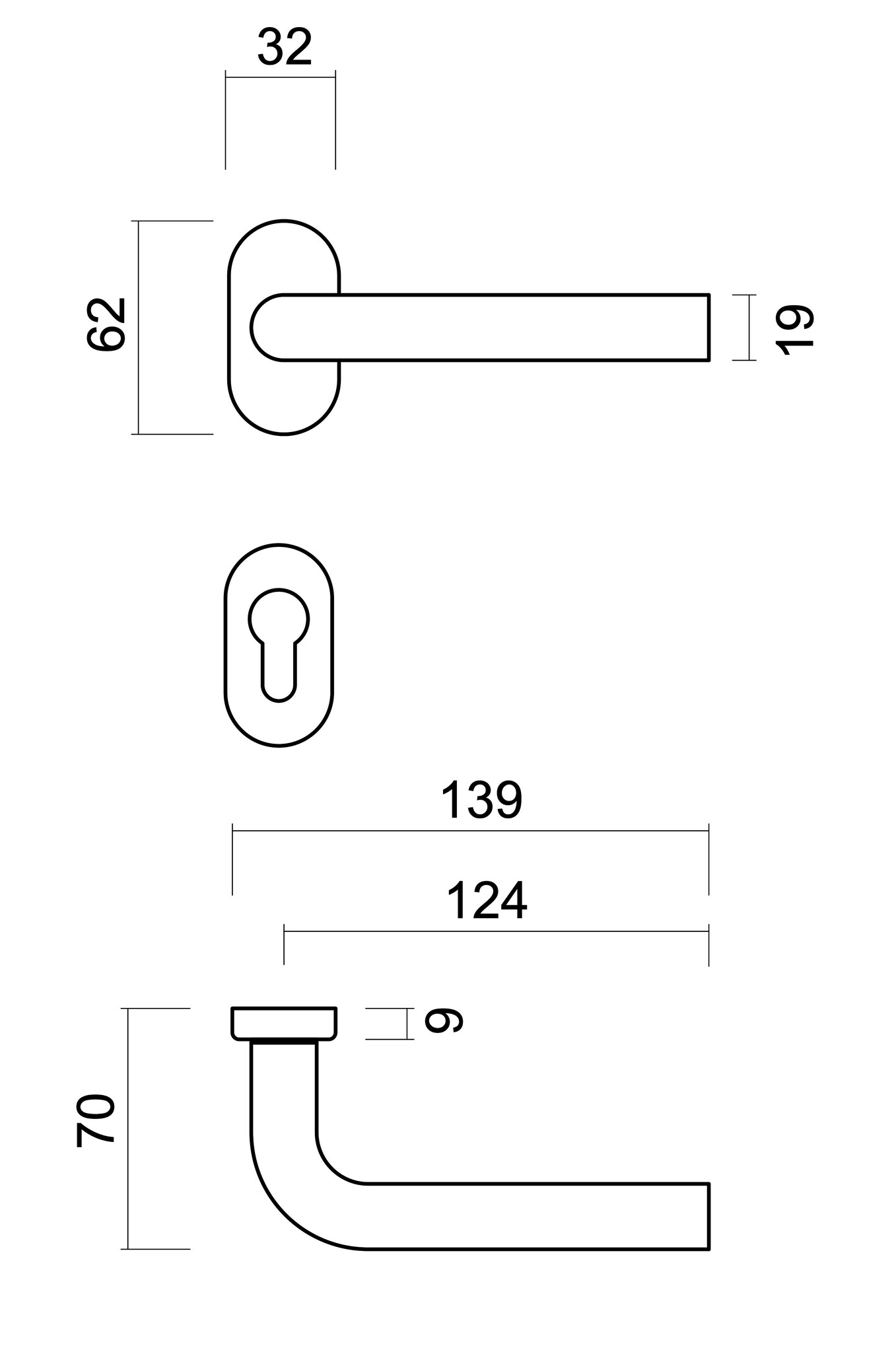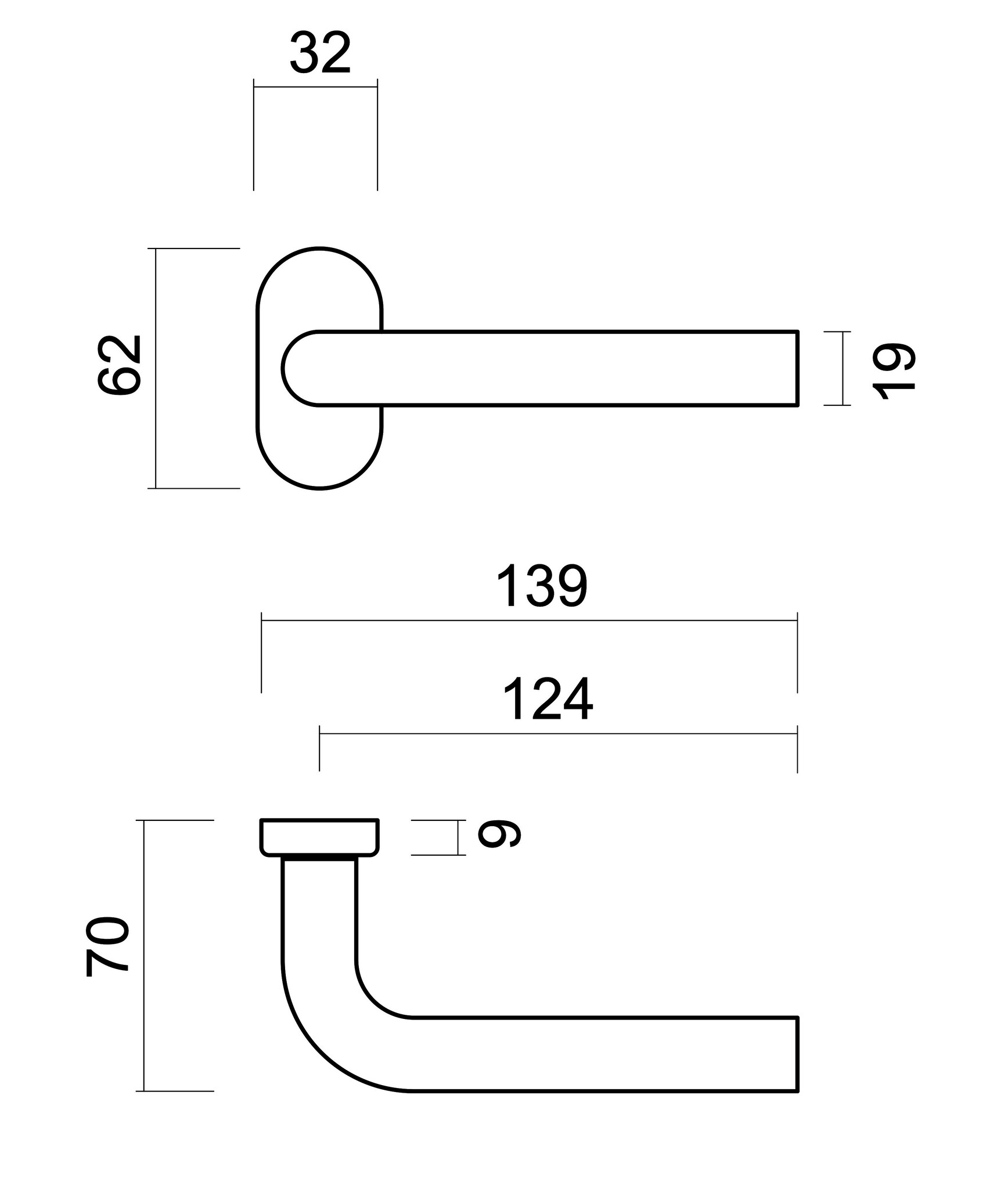 La poignée a une forme en L avec un coin incurvé et a une épaisseur de 19 mm.