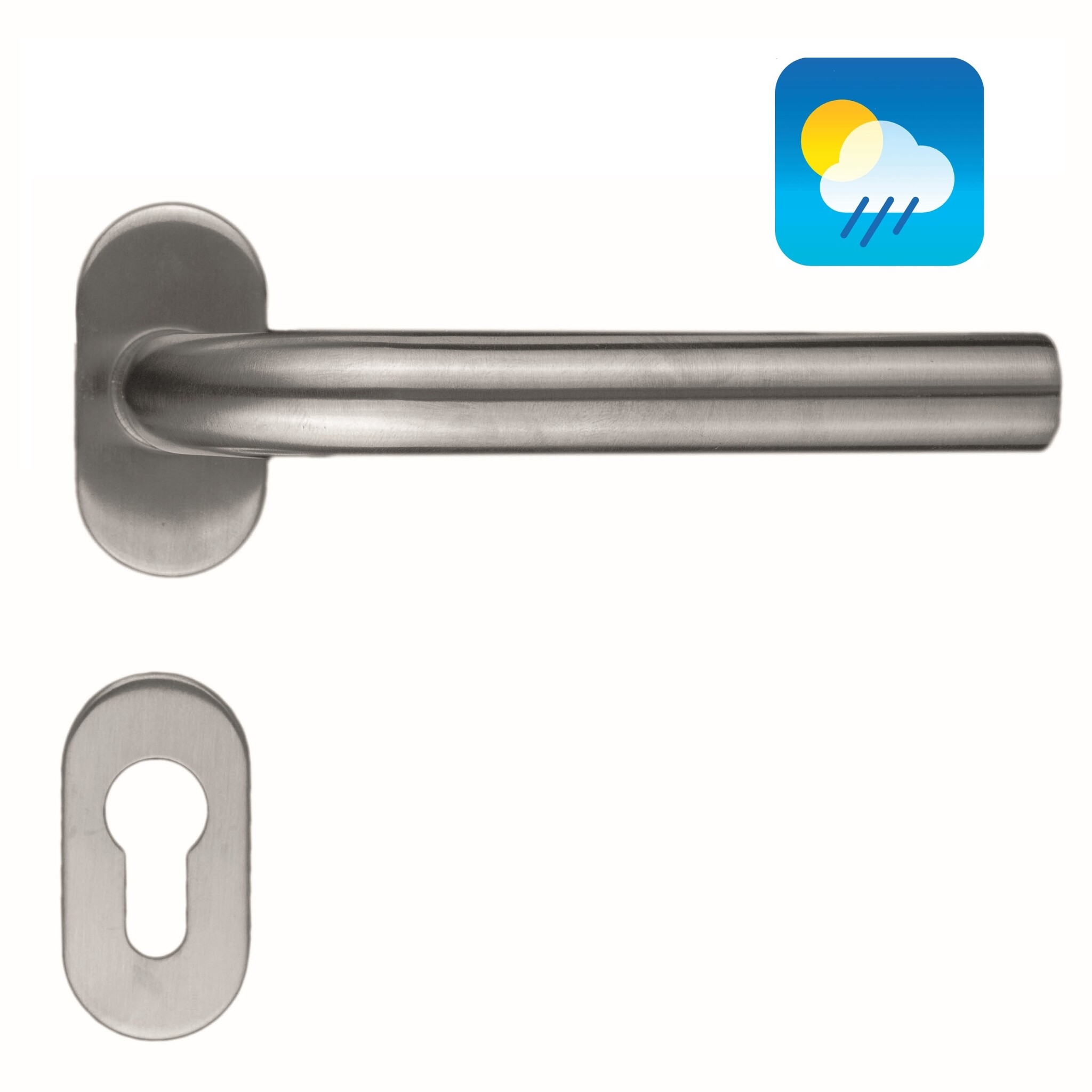 Poignées de porte en acier inoxydable profilées « L Shape » sur rosace ovale et adaptées à une utilisation extérieure, disponibles en 3 versions