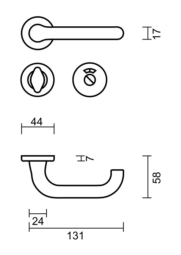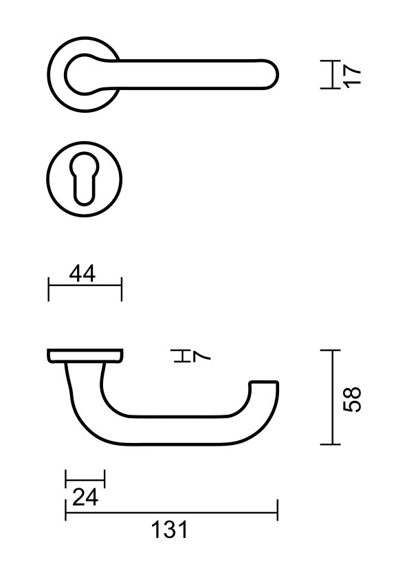 Les poignées ont un diamètre de 17 mm et sont montées sur des rosaces de 44 mm (non sur ressort).
