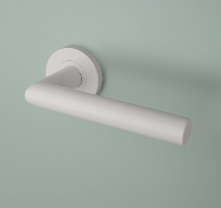 Ces poignées de porte blanches OVAL 1740 de STERK sont montées sur des rosaces rondes de 51,5 mm et de 8 mm d'épaisseur. L'avantage de la rosace est qu'elle est vissée sur la rosace de base au lieu d'être clipsée.